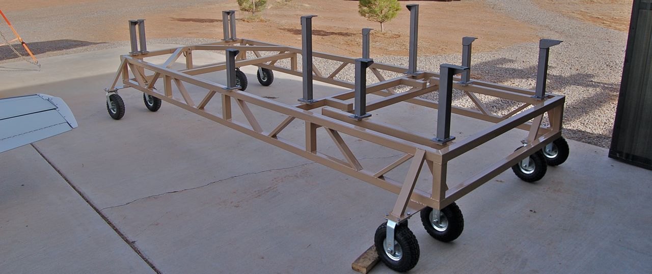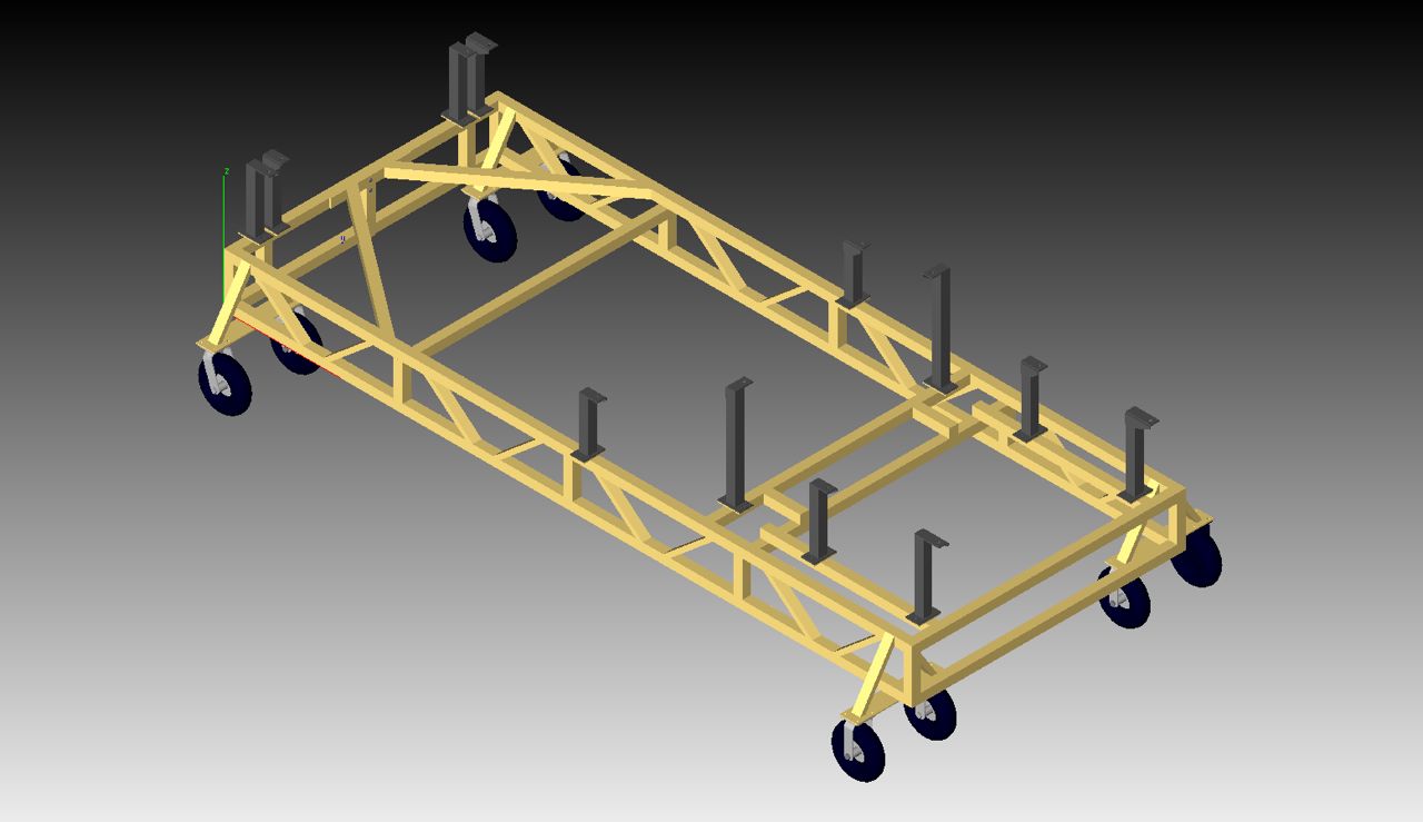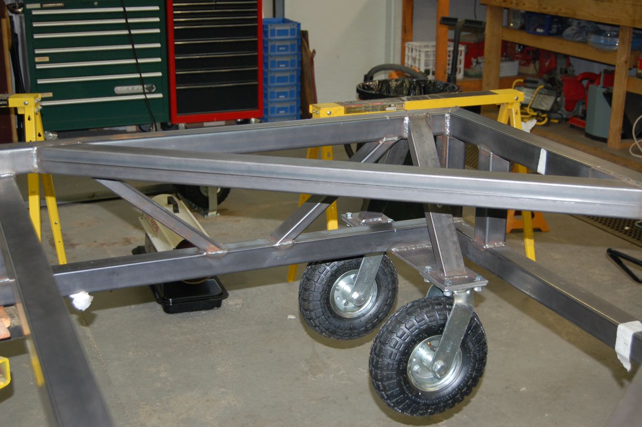 The advantage of this jig is that the vertical supports are bolted on, and so new ones can be made to fit other cars without having to modify the solid base rolling platform. With the dual tyres on every corner spreading the load out, it doesn't dig into gravel as much when trying to move it.