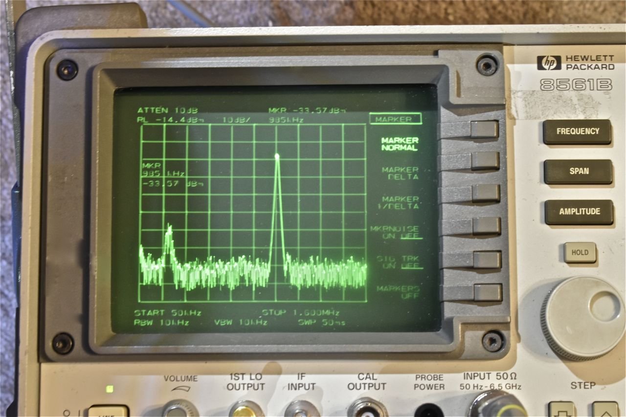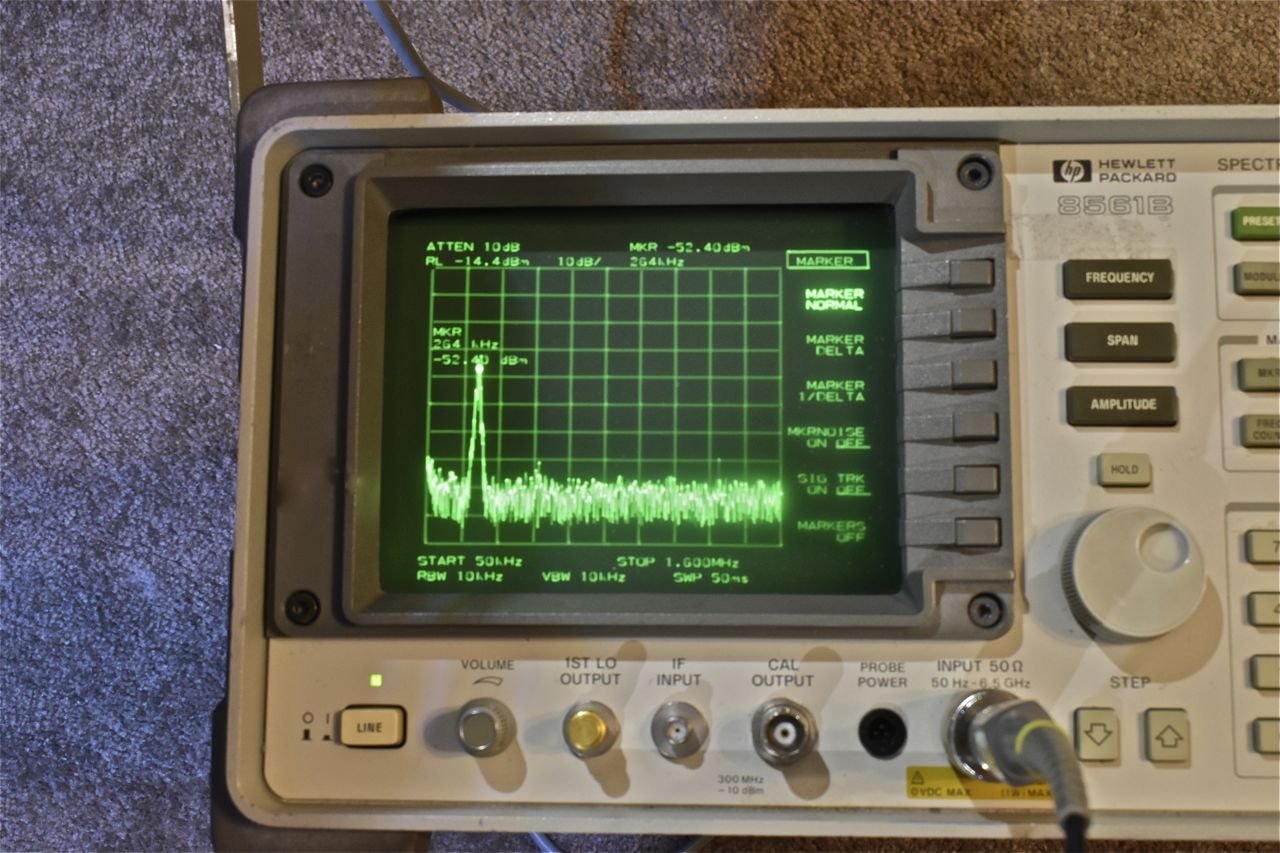 And there it is. So the first IF amplifier is working as well. This particular model spectrum analyzer has a built in AM and FM detector. If I switch on the AM demodulator, put the cursor atop the 262.5 kHz peak and turn up the volume on the spectrum analyzer I get the AM station the radio was tuned to. If I manually move the dial on the radio the AM portion is working just fine to this point.