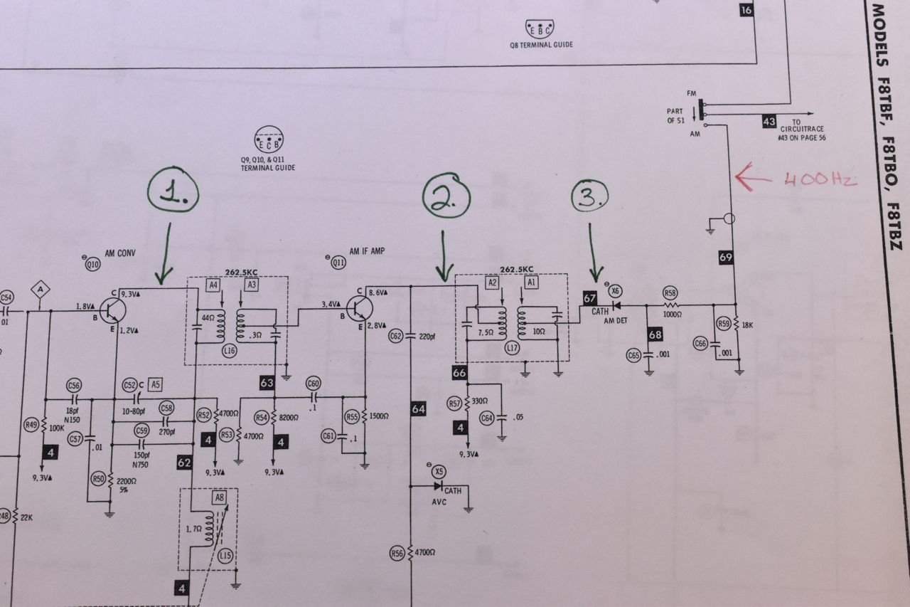 The plan is to first inject a 400 Hz tone where I have it in red ink to see if the signal is even getting to the amplifiers. If that works then divide the AM radio into 3 sections as indicated in green numbers circled and check for signal at those points.
