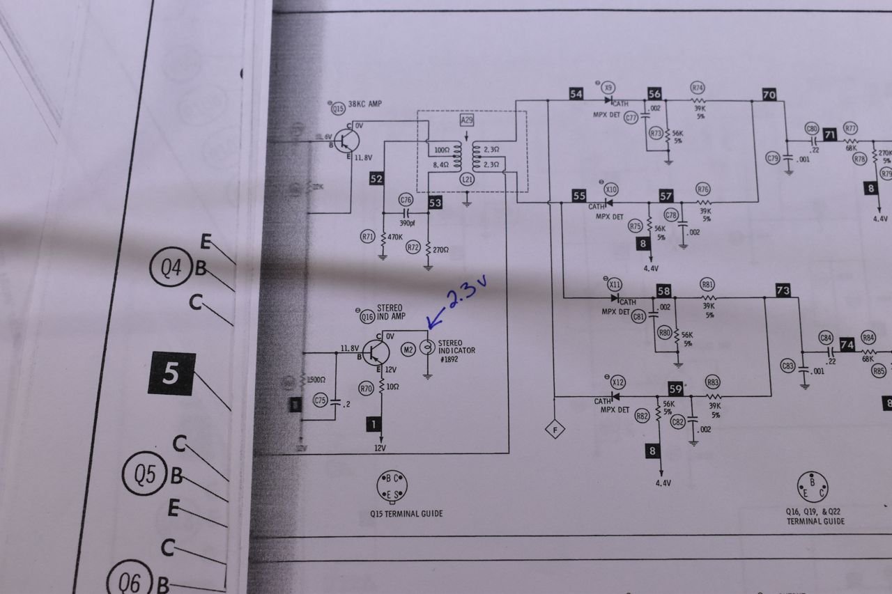 Well I only get 2.3 volts for a 12 volt bulb. If I put my peeper right up to the amber jewel on the radio I can see a hint of glow in a dark room. I doubt the stereo decoder is so far out of alignment as to cause the dim lamp because it has pretty good stereo separation still. I bet it's the transistor or R70 or both even.