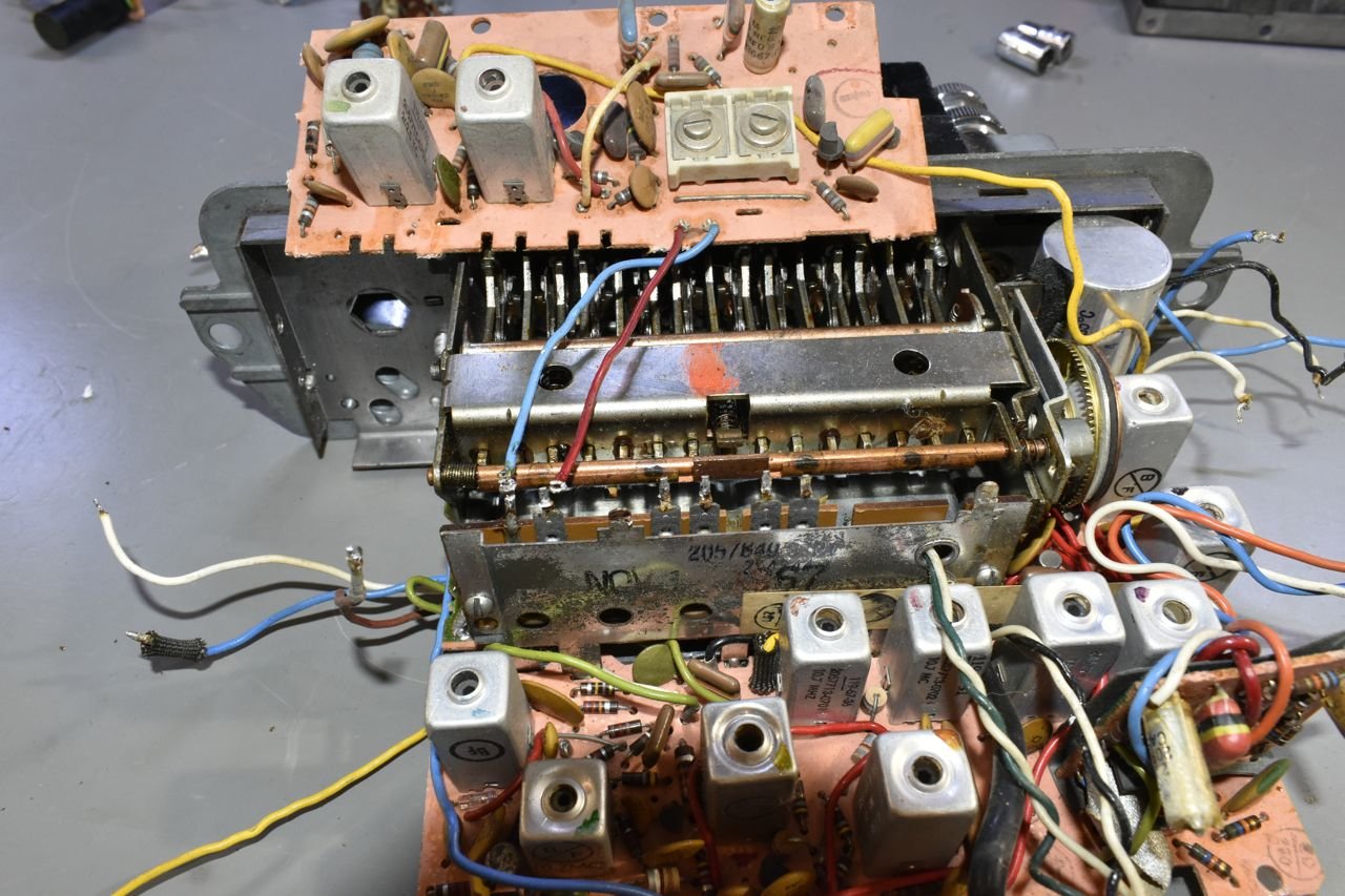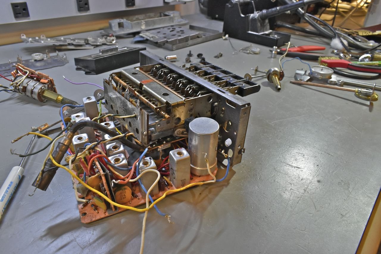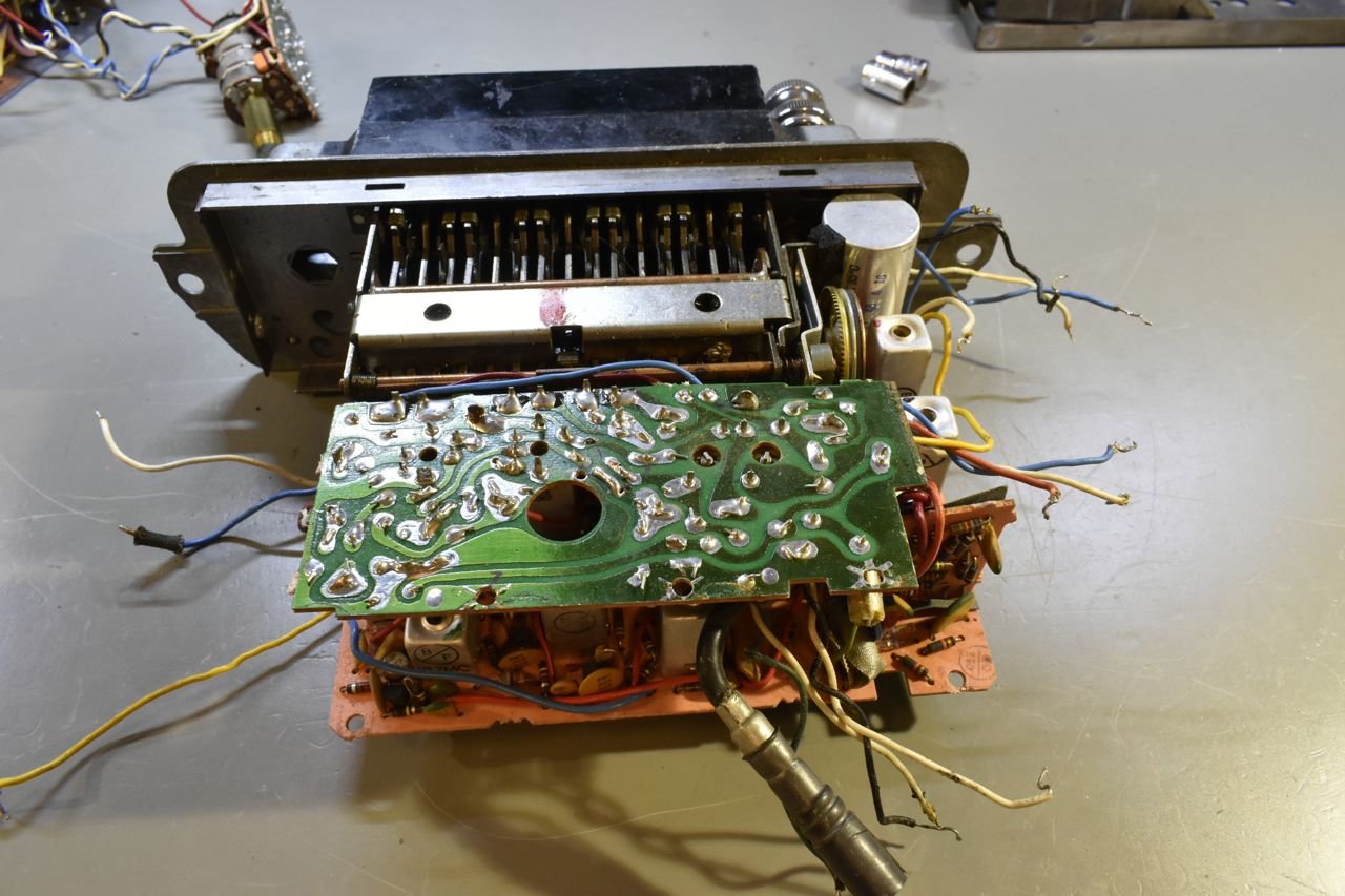 That little board flipped up is the entire AM radio portion. The remainder large 'L' shaped bottom board is the FM and stereo decoder. AM radios are very simple and very open if you take off the top and very easy to work on. This is antithesis of that.