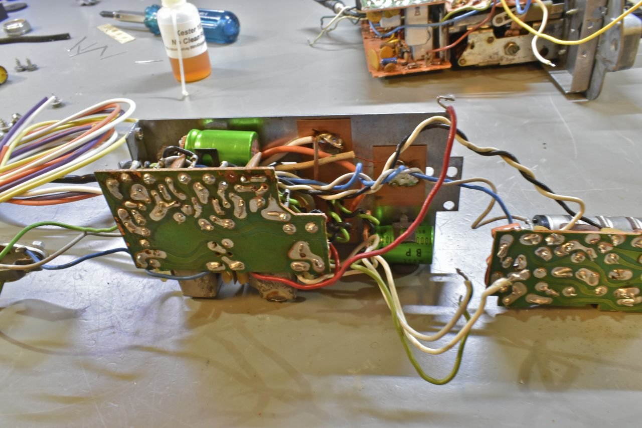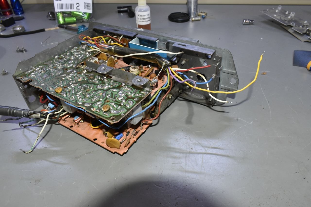 Here's the events that transpired without pictures. I powered up the radio driving just 8 ohm monitor speakers and what an improvement. At just 1/4 volume it's really loud in the lab. AM is alive albeit not really sensitive as it should be, I'm counting on it just needing an alignment after I was poking around mending that IF transformer.