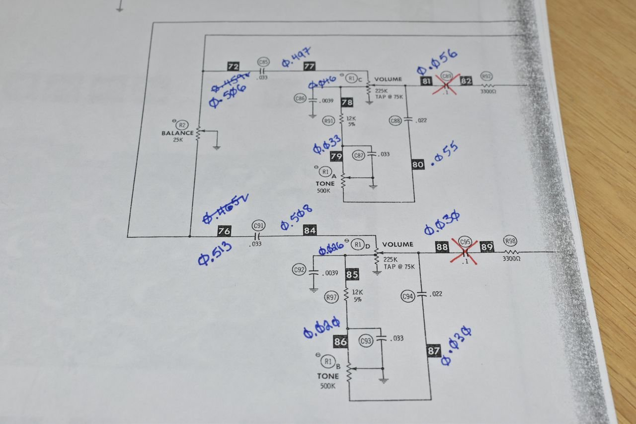 These are ac voltages from the test tones entering the volume/tone control circuitry. To make sure the amplifiers weren't dragging the signals down I removed the disc capacitors with the red X through them. From this you can see at the balance control I only have a R & L difference of ~ 1%. At the input to the amplifier section (out of the volume/tone controls) I have roughly 45% difference between R & L. Here's the problem area.