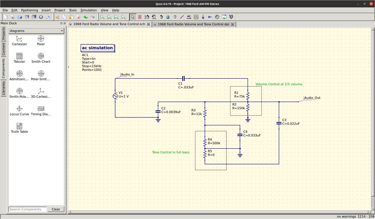 In this circuit rendition, you'll notice I have the tone control set at full base (full anti-clockwise) and volume at 1/3.