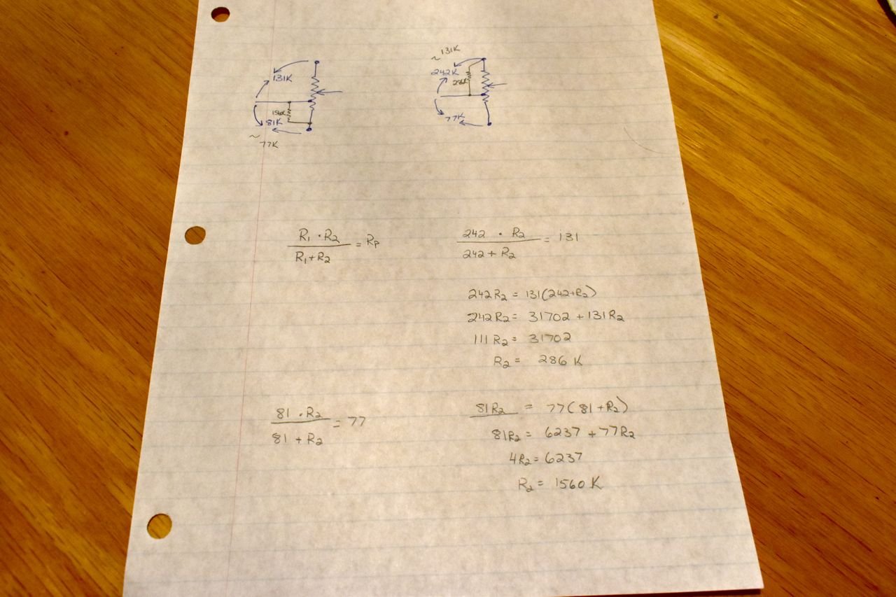 The equations at the bottom are just simple parallel resistance calculations to determine the extra resistors I need to add to each volume control.