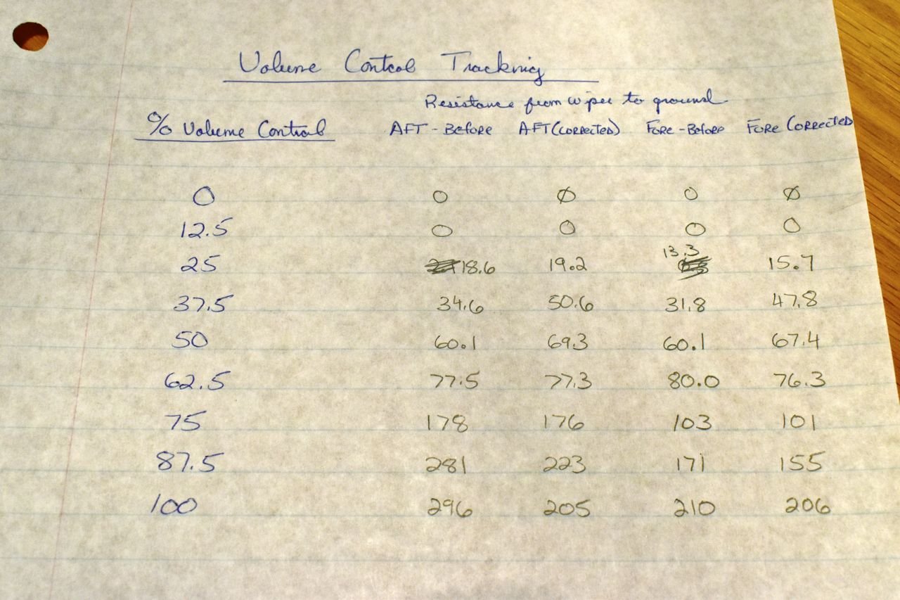 Pardon my handwriting. Aft and Fore refer to the volume controls as positioned in the radio from the front to back. You can see the L & R now track each other pretty decently till about 63% of travel on the volume knob. And after running the radio, anything past 50% is just distortion anyway and bloody loud as the amplifiers are clipping.
