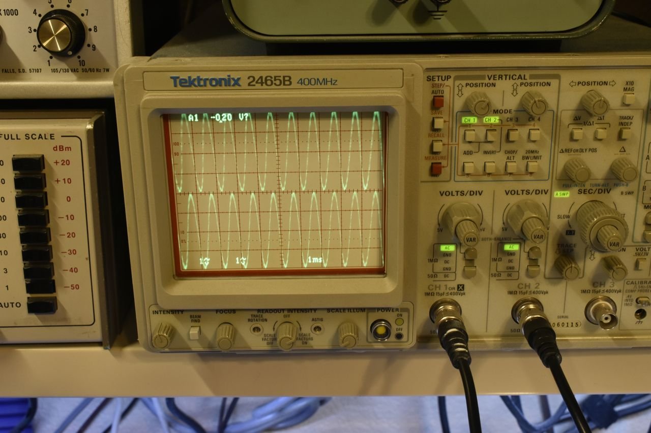 OK, you can see both channels (L & R) of the radio on the scope. And you can see the vague hint of stereo choppiness in the sine waves. That's the 38 KHz chopper working in the stereo decoder. Humans can't hear it, but I bet it drives dogs and cats insane if the tone controls, audio amplifier and speaker are allowed to reproduce that high.