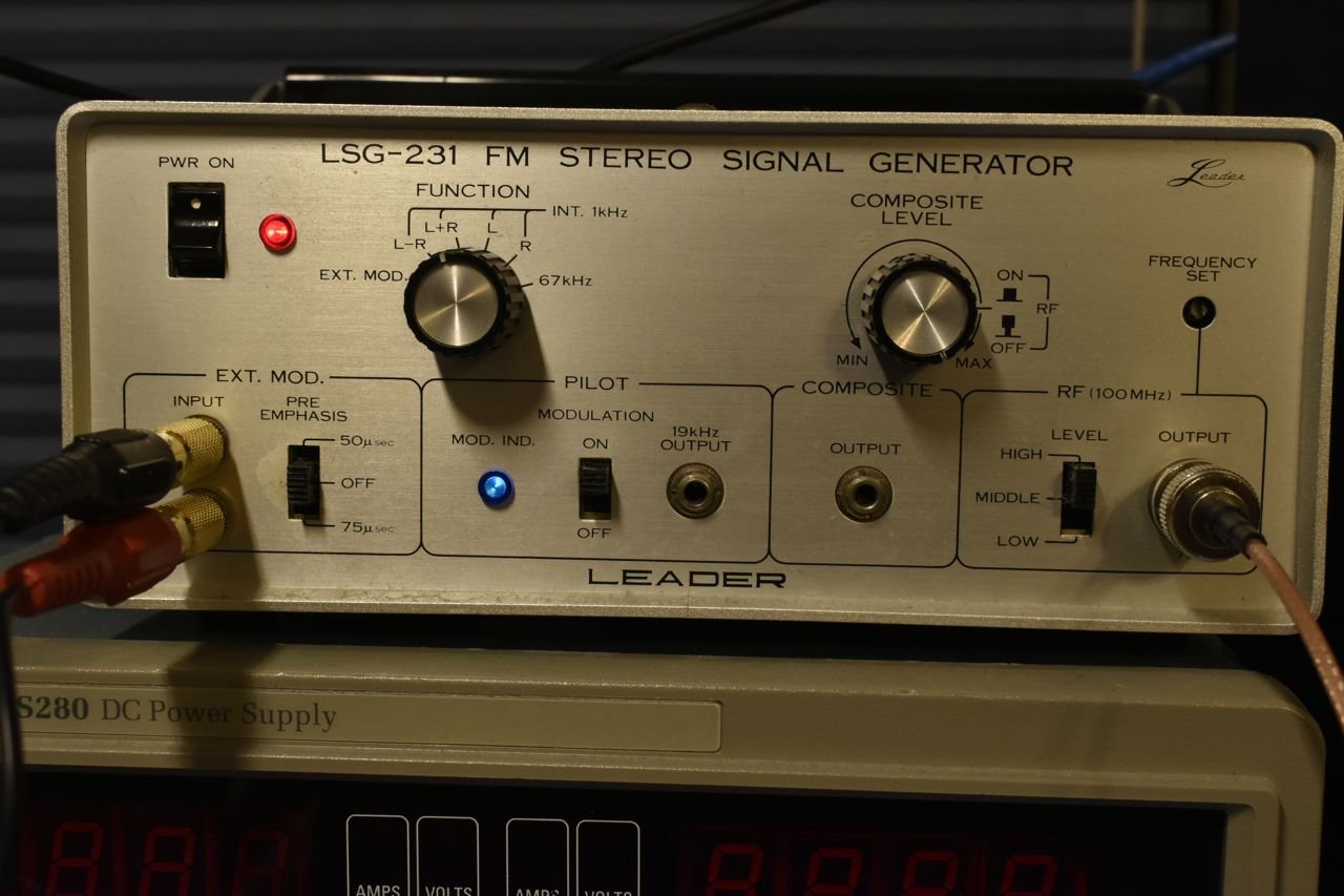 I only have two pieces of equipment that can do this. This is the Leader. It is currently set to send a 1KHz audio tone on both L and R channels in stereo (19 KHz pilot active by blue lamp). The Leader only transmits on one equivalent FM radio station which is 100 MHz.