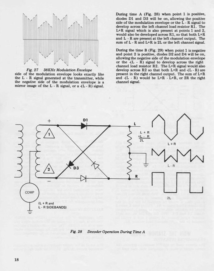 When a strong enough stereo signal is received, the stereo decoder needs the L-R information (from 23 - 53 KHz) along with the L+R information (normal monaural information) to mathematically produce the separate Left and Right channels. I'll get into that more in a bit.