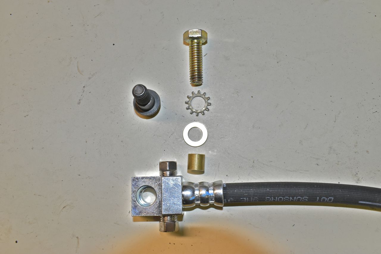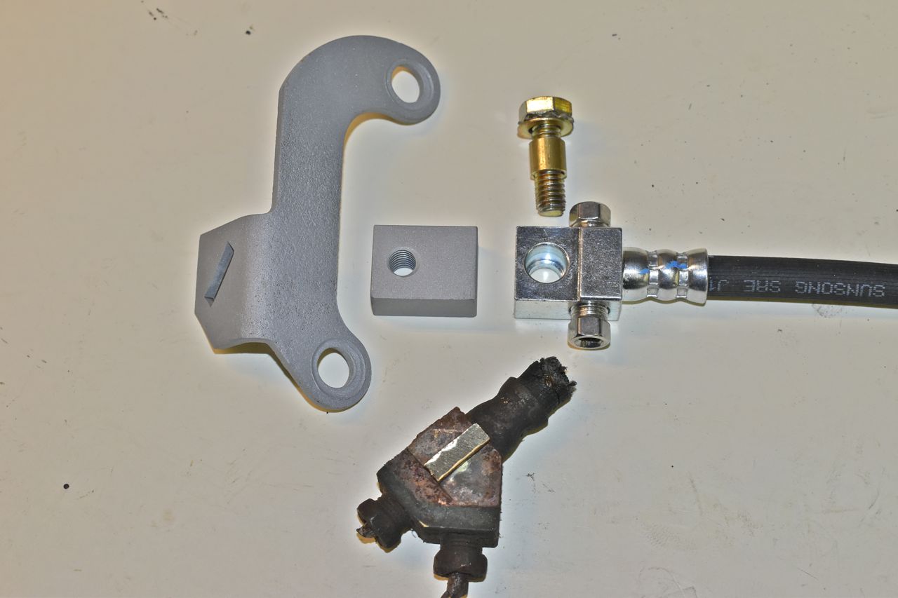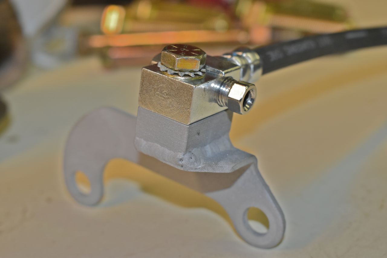 Next I needed a mount for the hydraulic line to the axle. I prefer to use OEM parts whenever I can. I am using the '73 GM hose and making a mount so I can use a Ford brake line bracket.