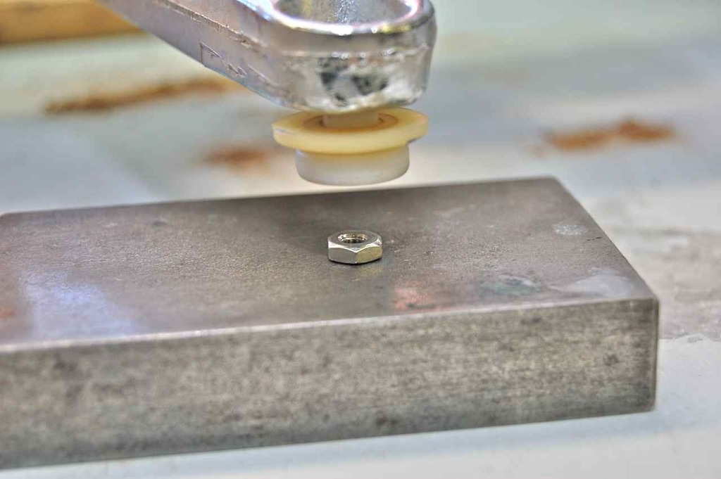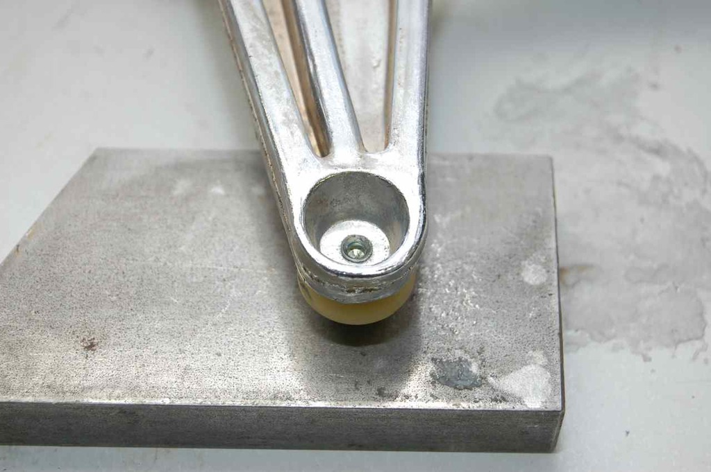 Since the roller axle is recessed in the roller a bit, I used a 8-32 nut to keep pressure on the axle only whilst the air hammer did its thing. There is a crimper for these but it's a bit pricey for something that you probably will have to only do once in your lifetime on one car.