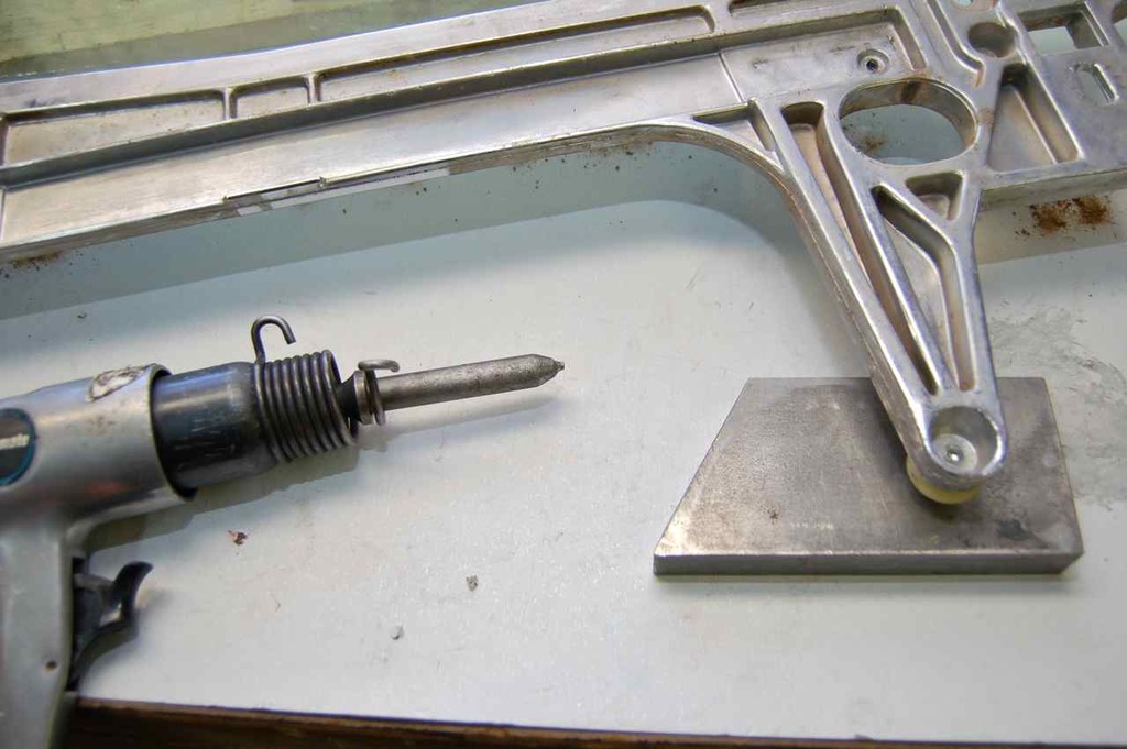 Nothing fancy here, I ground down a cheap air chisel bit to flare and flatten the new axle rivet end.
