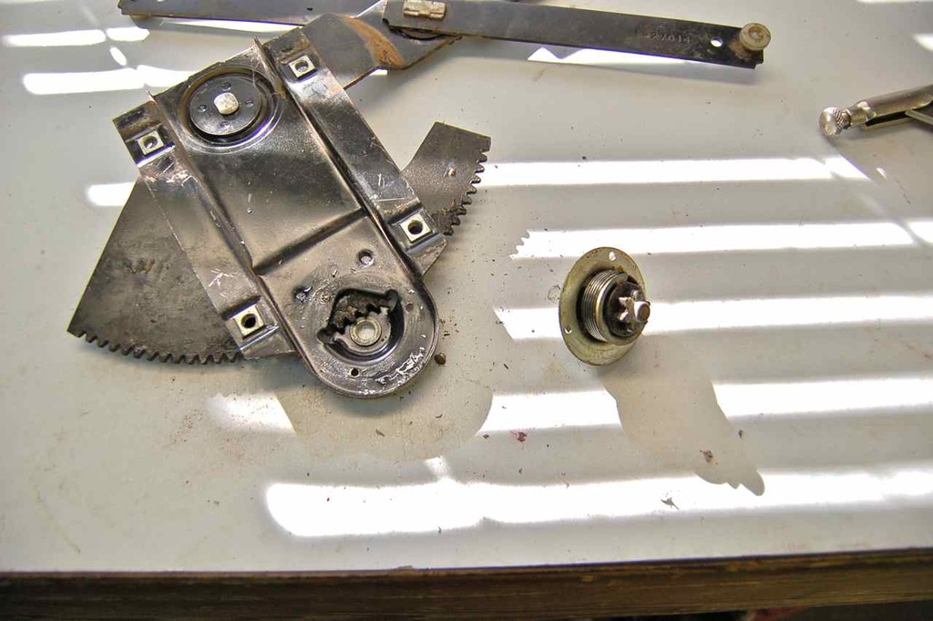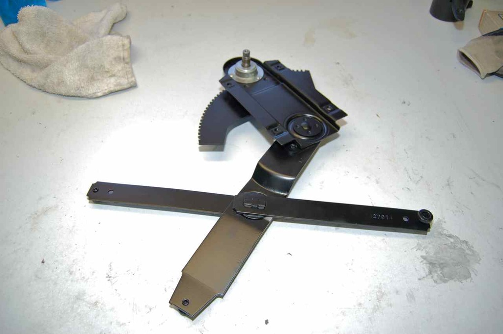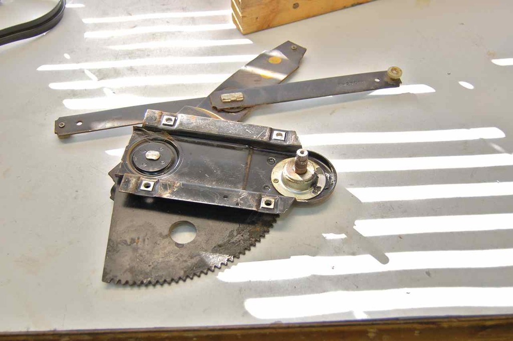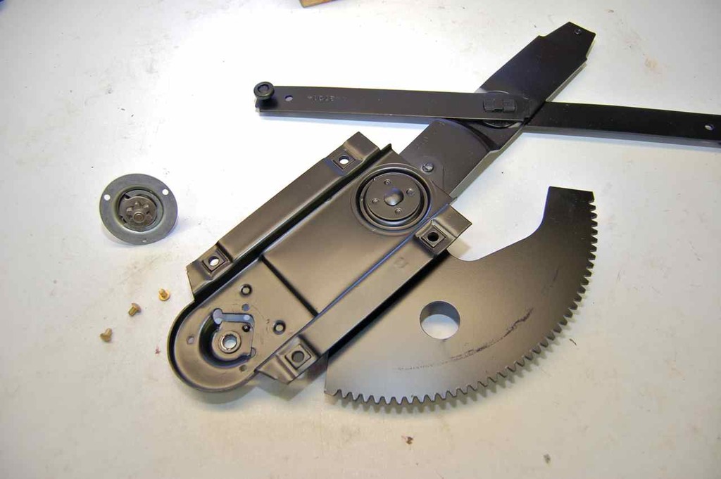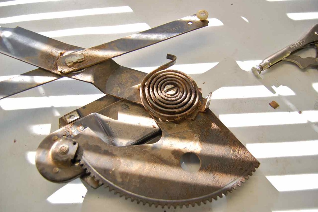 Agh the regulator, one main problem with this and quite frankly the entire car, is that all the lubrication everywhere is caked and hardened. The one way clutch (part of the crank handle assembly) was so gummed up it would not hold and the spring would cause the regulator to move closest to the unloaded position all by itself. This is potentially a bad thing as it also means with the windows rolled up and doors locked anyone could insert their fingers in the top and pull the window down and it would unwind. Not good...