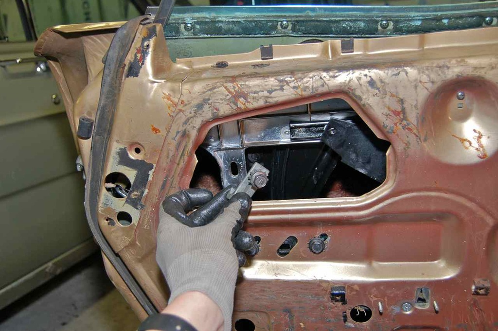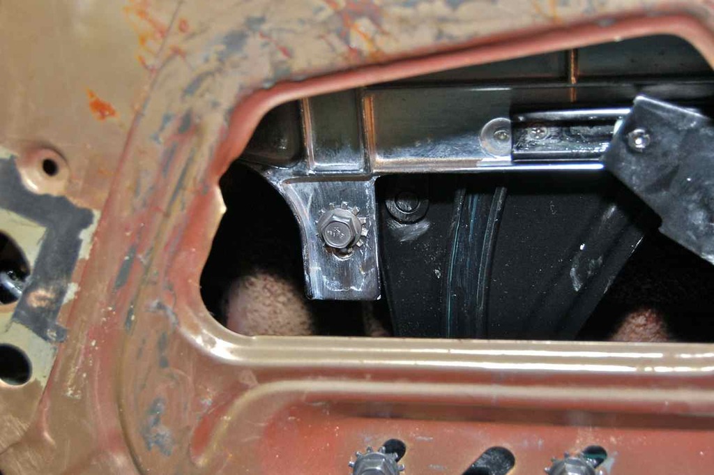 Note: The upper stops and small roller guide that bolts to the door should only be used to fine tune the window for small errors in alignment. When there isn't sufficient adjustment left in these or the window starts binding, the main window track (the large panel that looks like part of a train layout) is the course adjustment and should be moved about. It can control (to a degree) fore-aft position of glass as well as skew or fore-aft tilt.