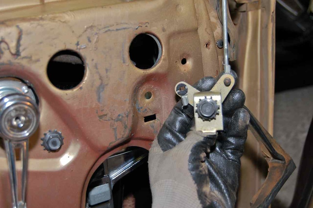 Install the door lock bell crank and connect the door latch rod floating in the top of the door.