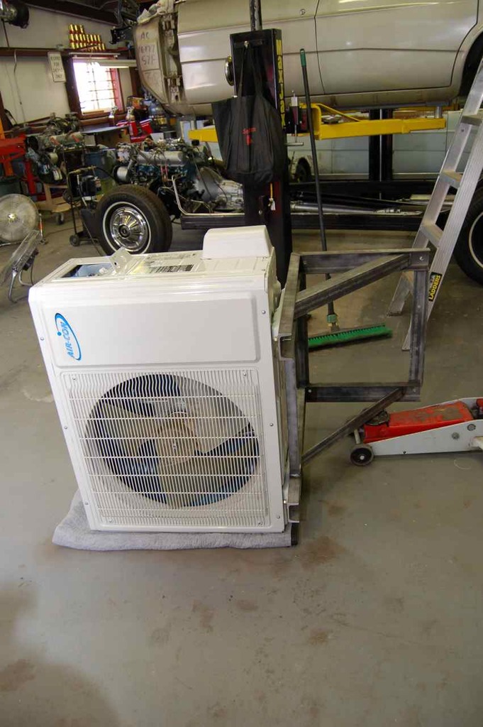 The next body mount kit I buy, I'm going to use the extras for mounts for this outside unit on the bracket. Actually I use those extra body mounts for quite a few things, such as the propane furnace in the shop (suspended from ceiling) and the 2 hp exhaust blower for the make shift paint booth.