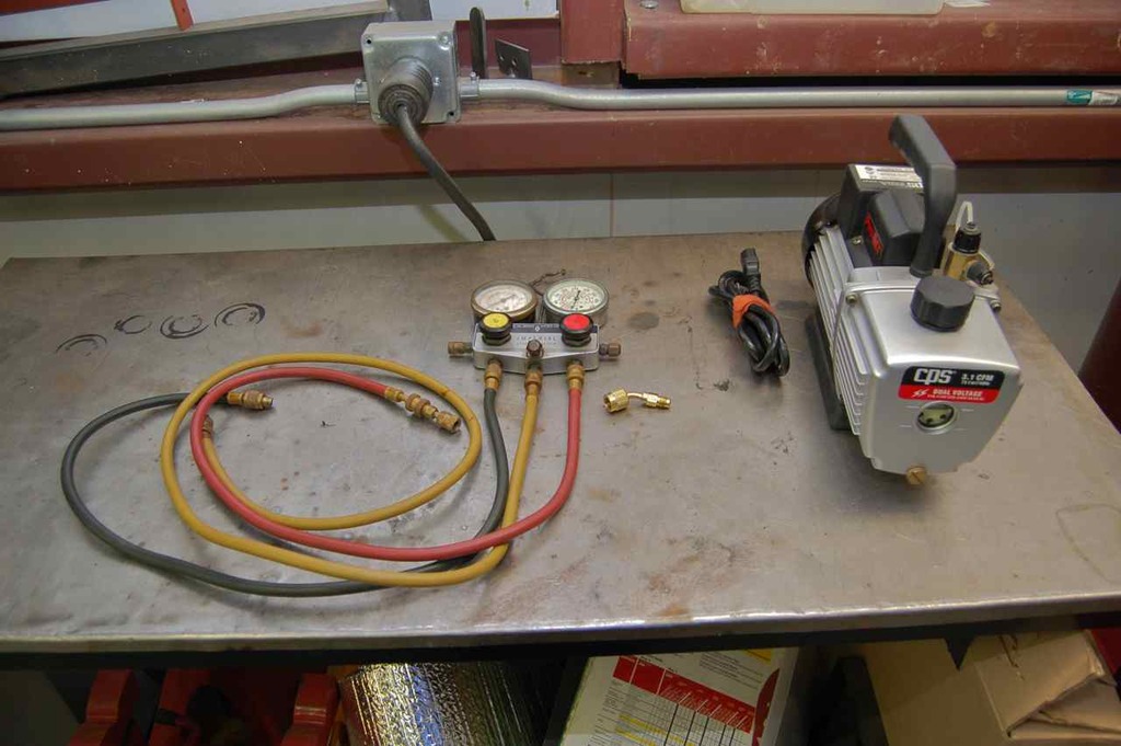 The middle brass adapter is a R410a to R12/R22/R502 adapter and of course you'll need a gauge set (checking vacuum only), so any R12/R22/R502 gauge set will do and a vacuum pump. The outside unit comes precharged with the exact amount of refrigerant and oil for the included line set and interior unit, but after you connect the lines you need to draw those components down to a vacuum and check for leaks before opening the Rotolok valves on the outside unit.