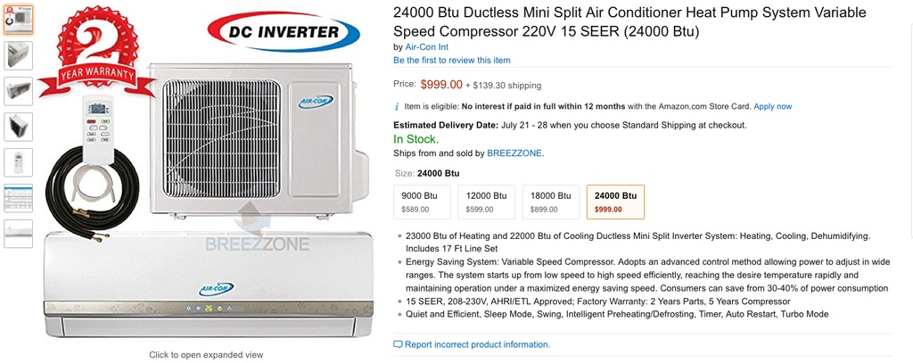 Being it's a regular outdoor metal building, it was never intended for an HVAC system so there is no air handler, which made the decision to use a European style mini-split system as it includes the interior air handler. The cheapest 2 ton unit (1 ton = 12,000 BTUs) I could find was this:
