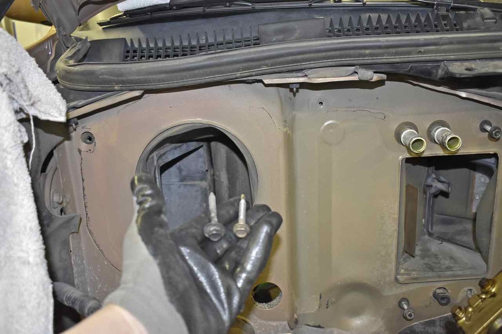 I swear Ford wanted to see how many different fasteners they could use to hold the plenum to the firewall. There's two sheet metal screws (different thread pitches) that go atop the plenum. The self tapping sheet screw goes on the right hand side and the regulator sheet metal screw on the upper left.