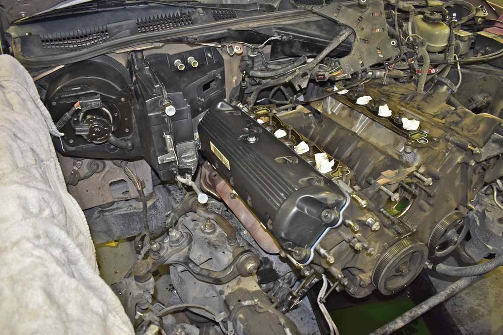 Clean off the mating surface on the head for the new rocker cover gasket. You'll notice it's still a tight fit getting that HVAC plenum on and off. You'll be brushing up head and control arm taking it off and on, but nothing detrimental to the parts.