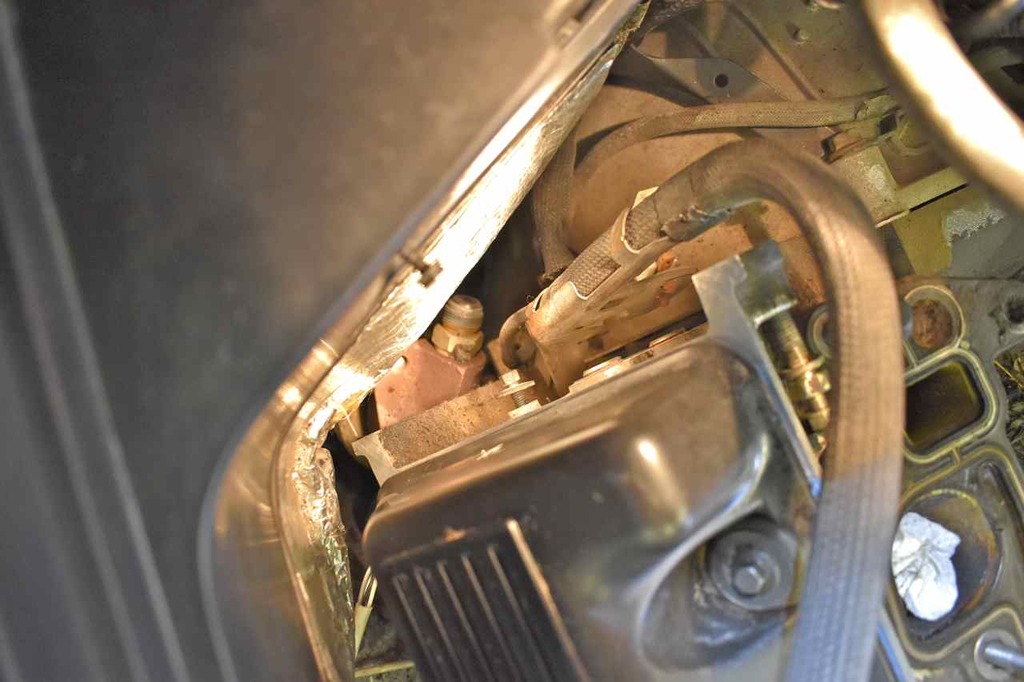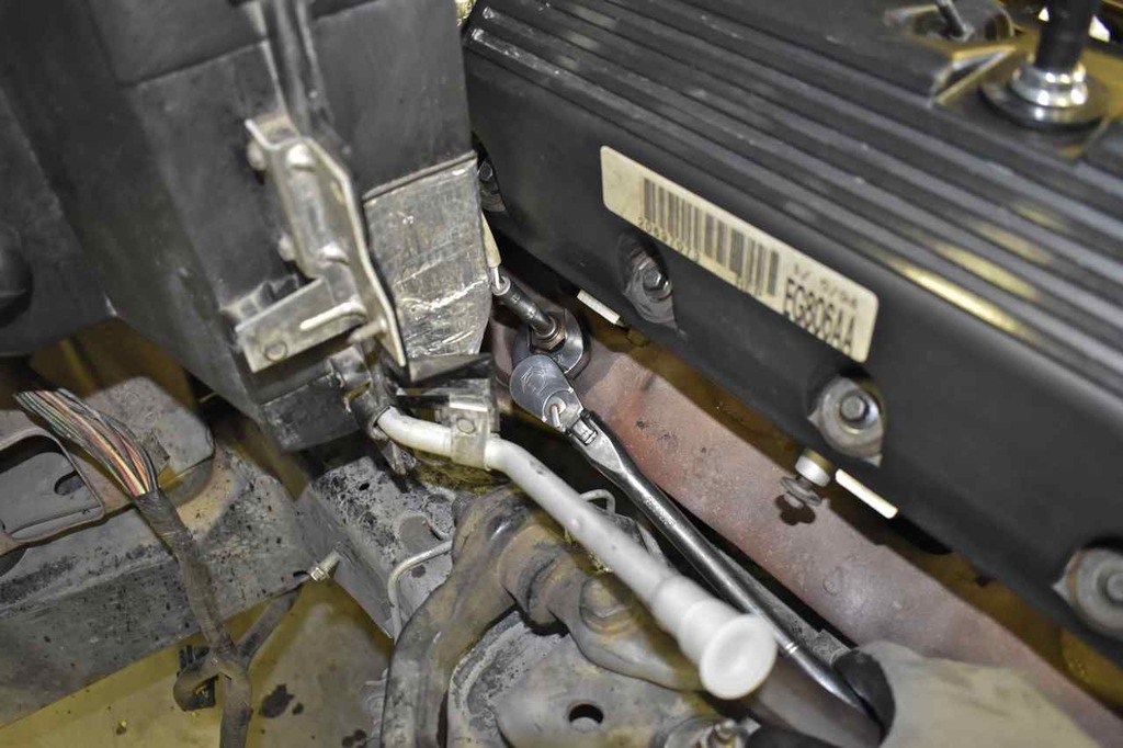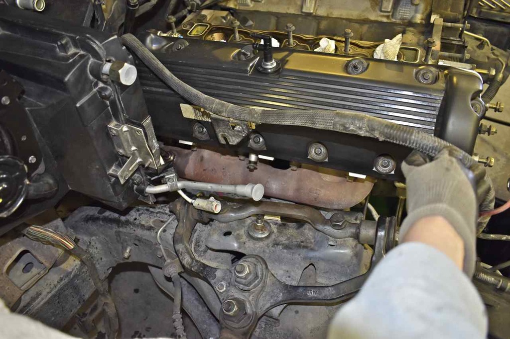 Next is the harness that contains the positive and negative battery cables. There are two mountings on the engine for the harness holders. One on the side here (if you look sort of midway on the exhaust manifold you can see the bolt loose in the head.) And the other is on the back side of the pass head.