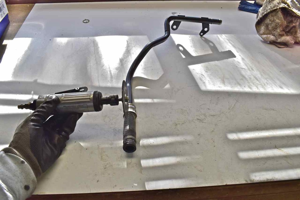 Next take a cutter and CAREFULLY slice off the crimp cuff holding the hose to the metal pipe.