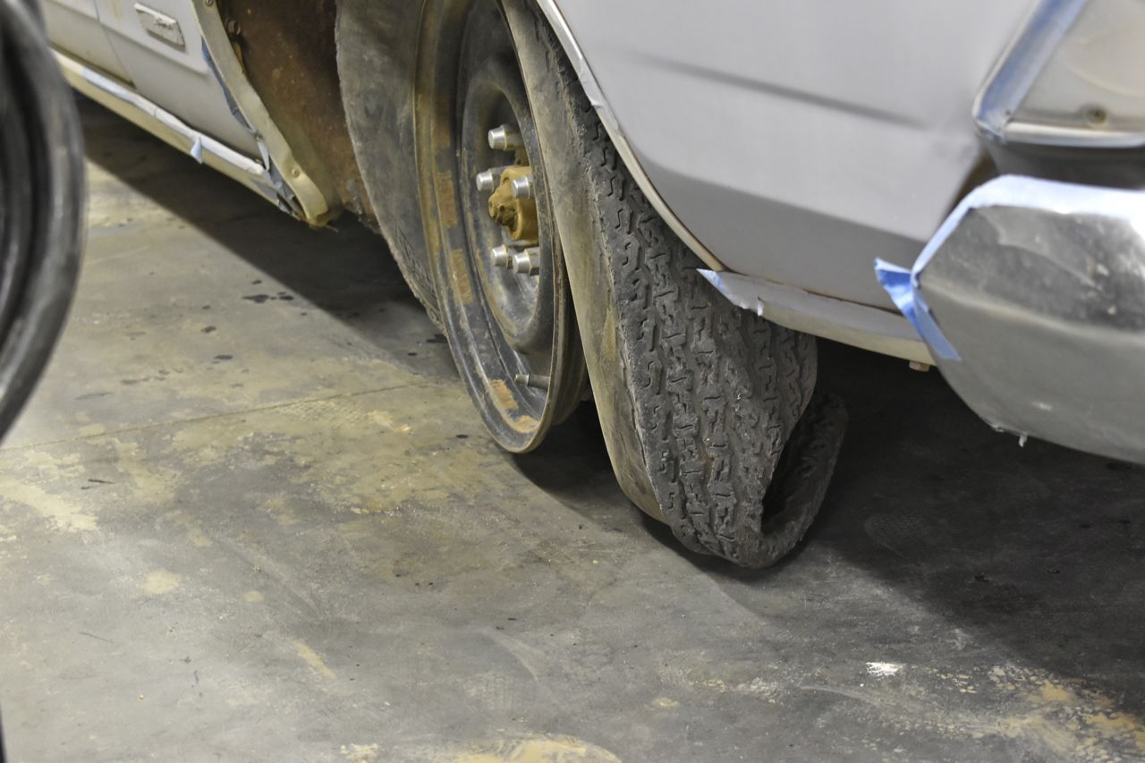 I don't know what's more amazing, the fact that no one has junked this thing by now or that it actually rolled in under its own power. When we bought it, it came with odd size tyres all round and they didn't hold air all too well. One finally split and wouldn't take any air so I drove it in like that. The goal here was to find 4 matching rims with decent matching tyres for now. I'll order new tyres for it once it's ready.