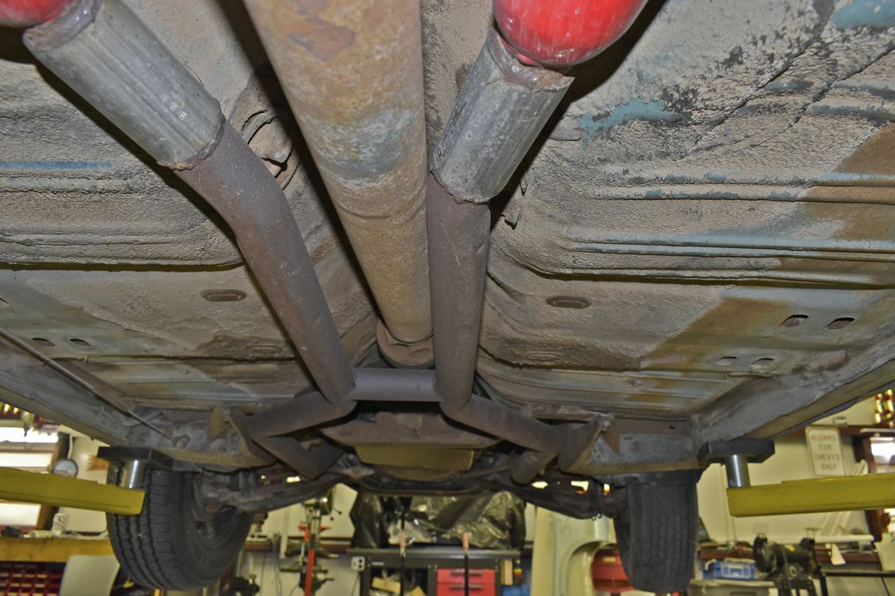 So the previous owner or one of the previous owners, who knows, sawed off the Ford mufflers and put glass packs on. Otherwise it's the original exhaust still. And yuppers I'm pretty sure that's fence post as couplers. Out here, if that was anything else I would be surprised.