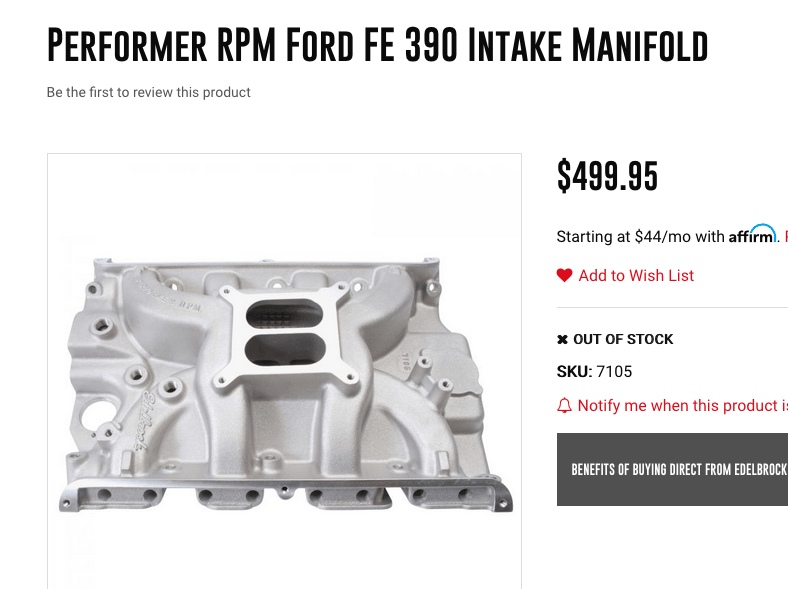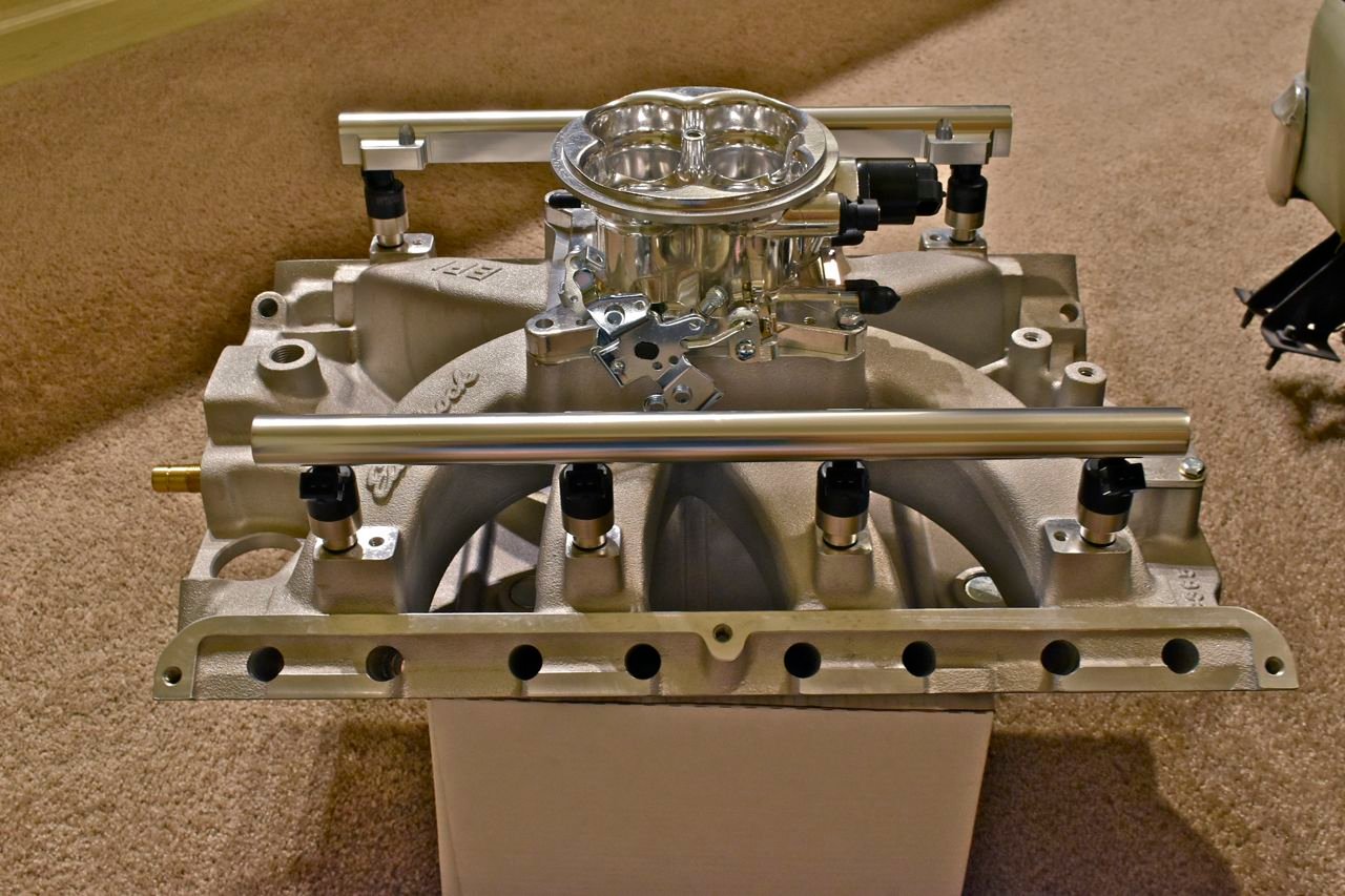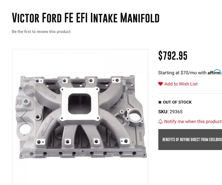 I will say that Edelbrock Victor EFI intake is one very large and heavy intake for aluminum. I did order a spattering of different parts to comprise EFI for the FE. I can see some machining work will have to be done to the intake. You get a lot of intake for 800+ dollars but the fit and finish of some areas are bit slap dash.