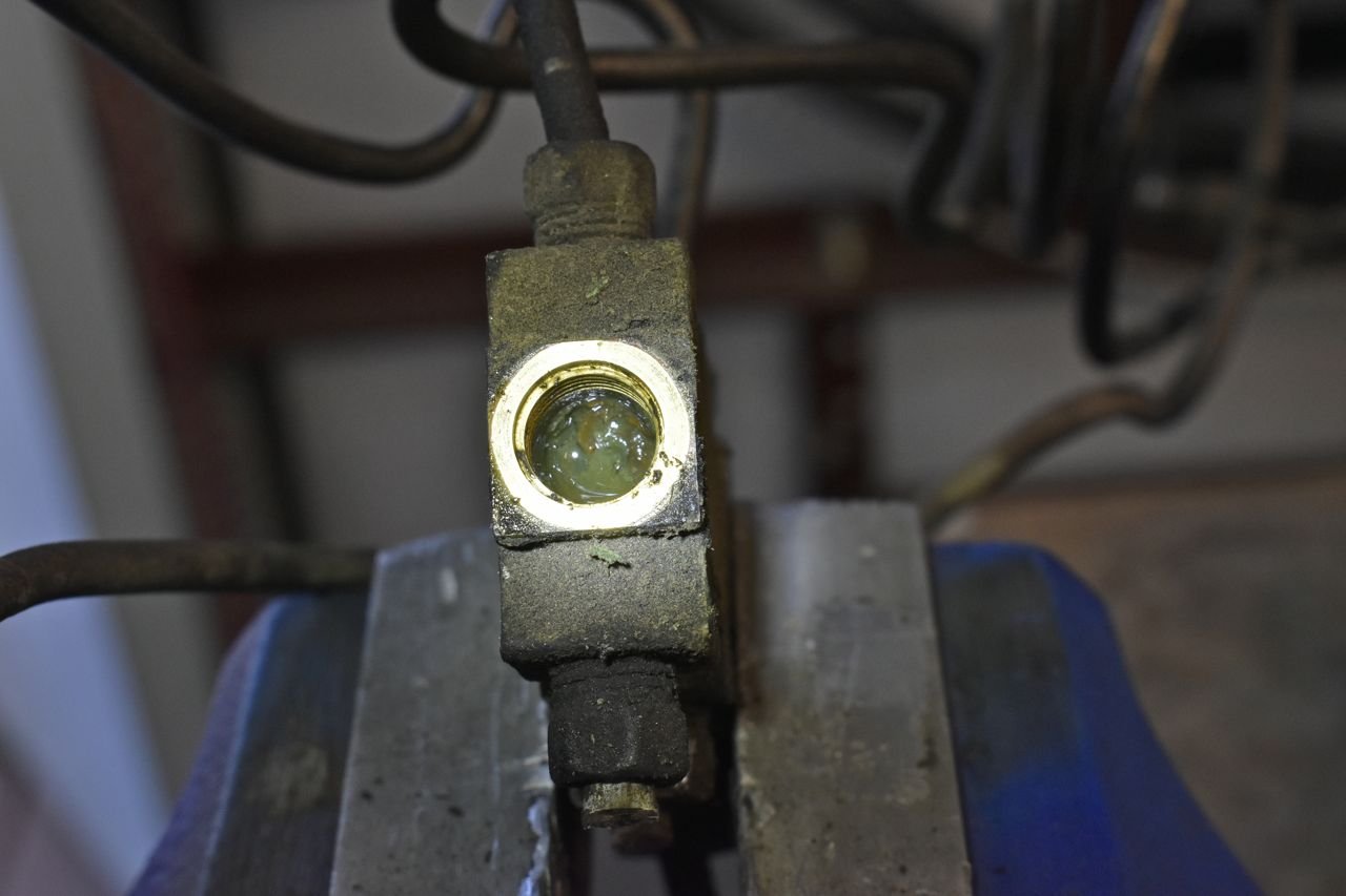 This is the 1968 brake valving assembly and those fittings are seized on there. I just cut the lines as I already knew it would be best to make as many new lines as I could from the fluid contamination. Speaking of which, how does that much water get in brake fluid from a car from the southwest where I count on my fingers on how many times its seen rain in its life.