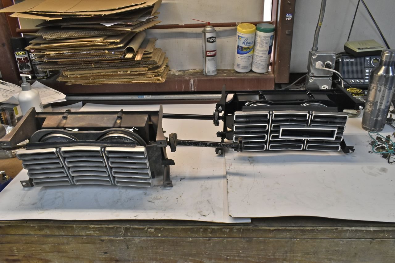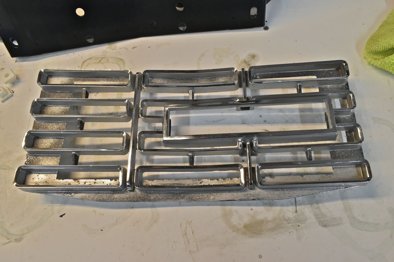 I studied these hide-a-way headlamps and I was impressed at what it took to produce these. These had to cost Ford a tidy sum to mass produce. The finish on these die cast grills is complex. First it's all chrome plated, then the top surface is masked off, then the whole thing silver painted, then the top and sides of the extrusions are masked off and the bottom flat areas are painted black. That's a long process on an assembly line!