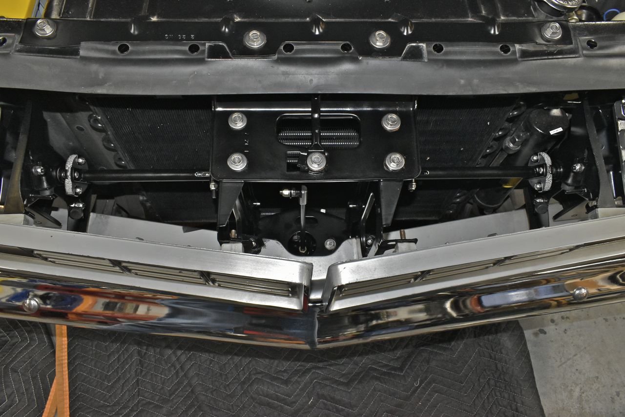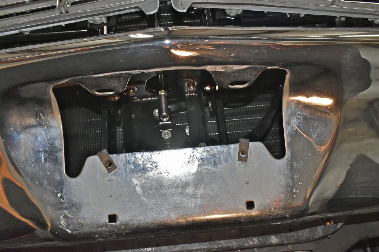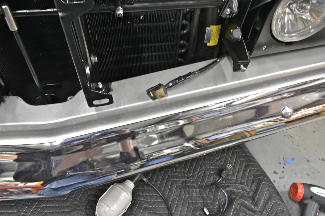 Looking through the license plate hole. I spent quite a bit of time planning this so it fits nicely and clears the bumper and condenser with room to spare and still all tucked under the bumper.