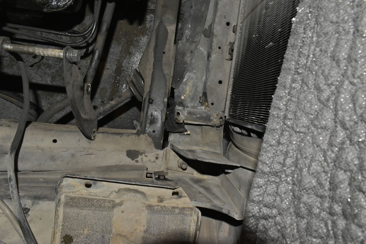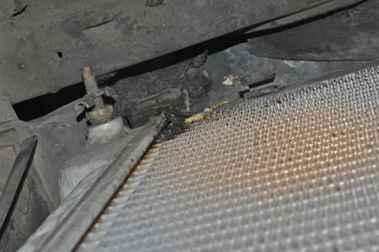 Someone put layers of rubber on the lower mounts, but you can see the corrosion from the aluminum radiator. Now if they would have painted the radiator in a thick enamel or such around the perimeter, it might have survived.