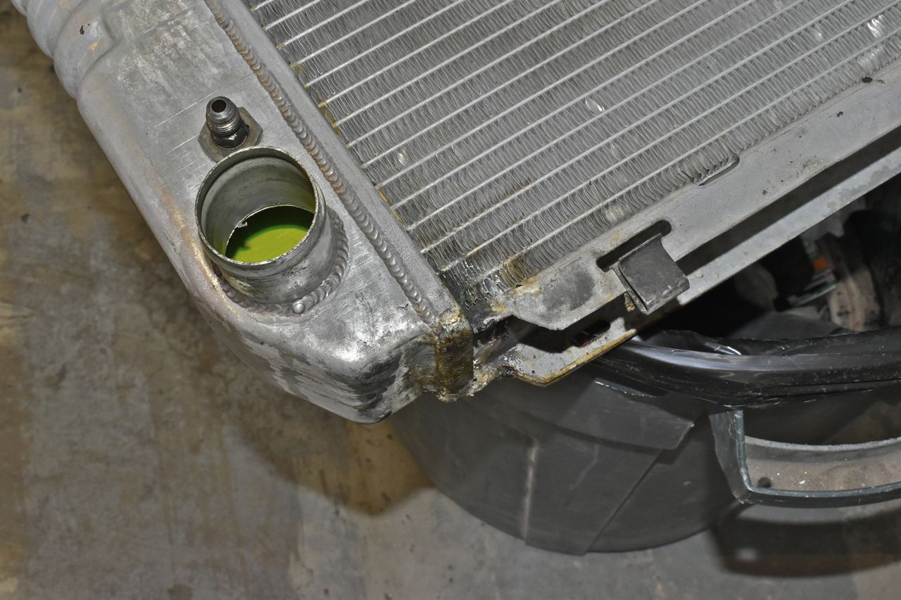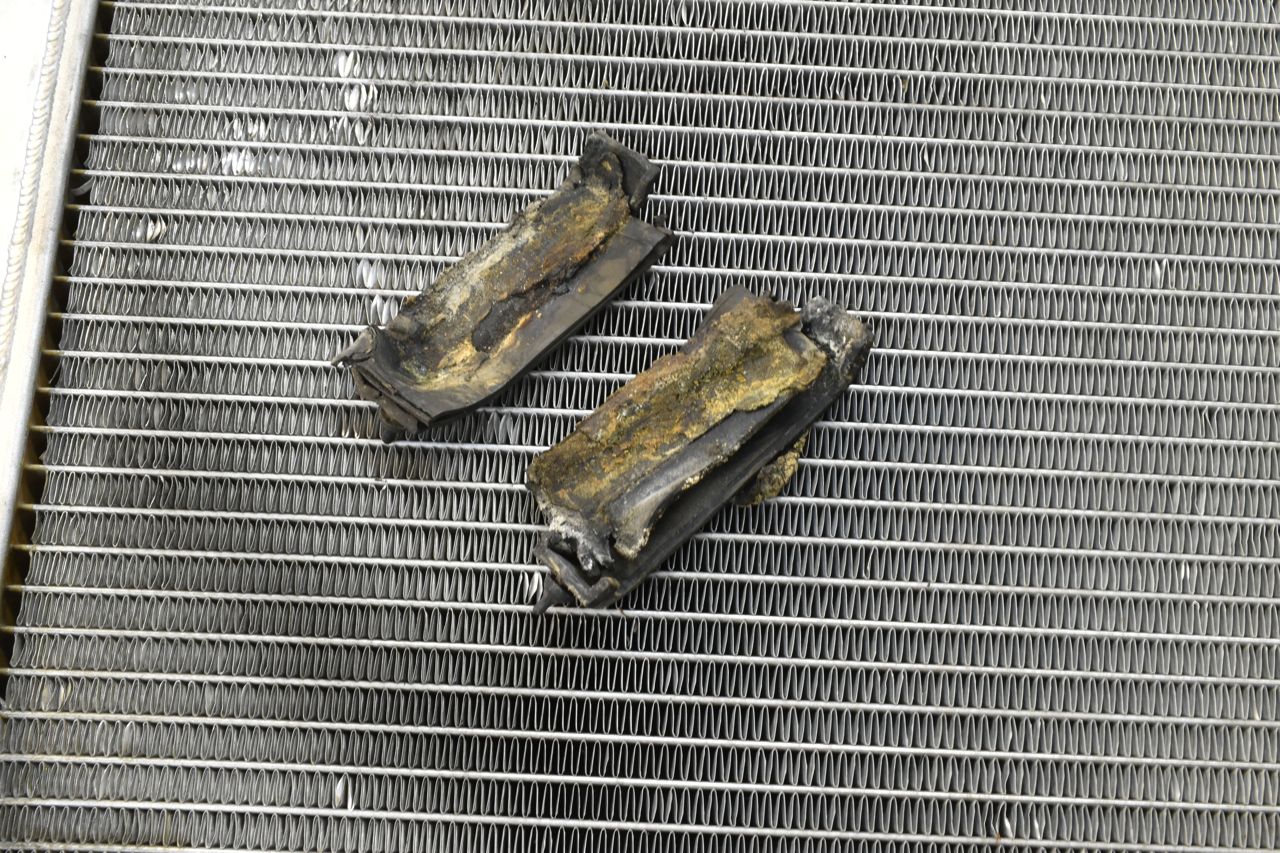 This is the radiator, it's a Griffin but because the radiator is directly connected to the transmission via the steel cooler lines it's electrically connected to the chassis/body. So when a little moisture with minor salts sits between the aluminum radiator and the steel mounts, it acts like a galvanic battery and the aluminum dissolves and the current flows.