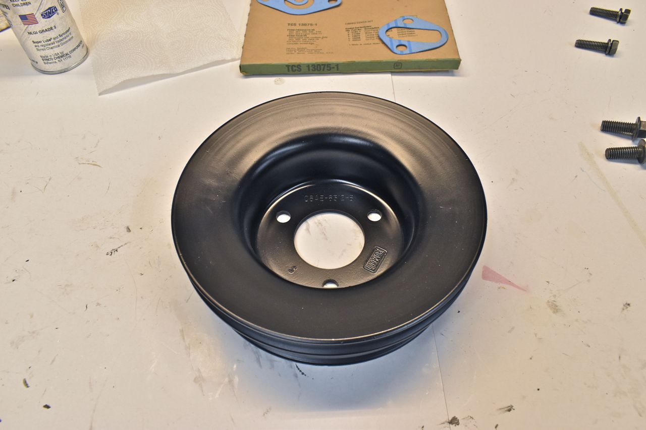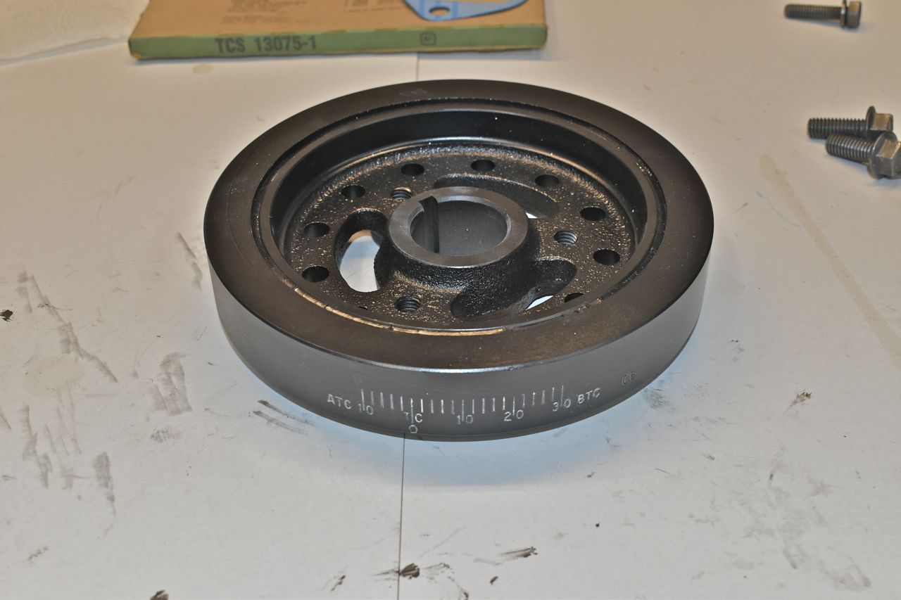 I prepped a donor damper as this is a '68 damper and the car had a later year one on it. Turns out the timing marks were still in the same location, so the pointer was the same as well. But doesn't hurt to the have the correct year part on it.