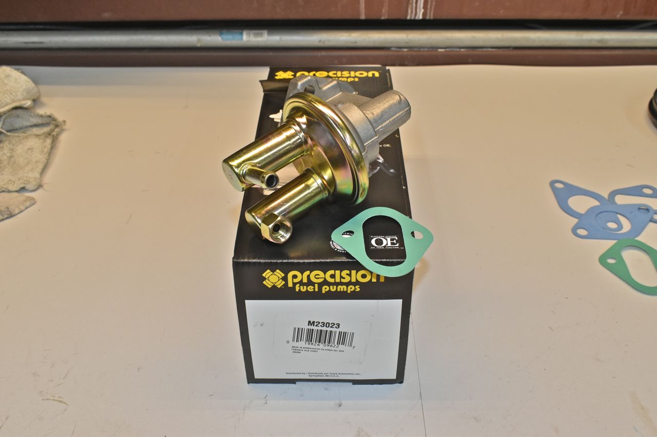 Since everything was baked on this car, a new fuel pump was in order, that and someone strong armed the fitting on and I rounded the fixed fitting on the old pump trying to get it off.