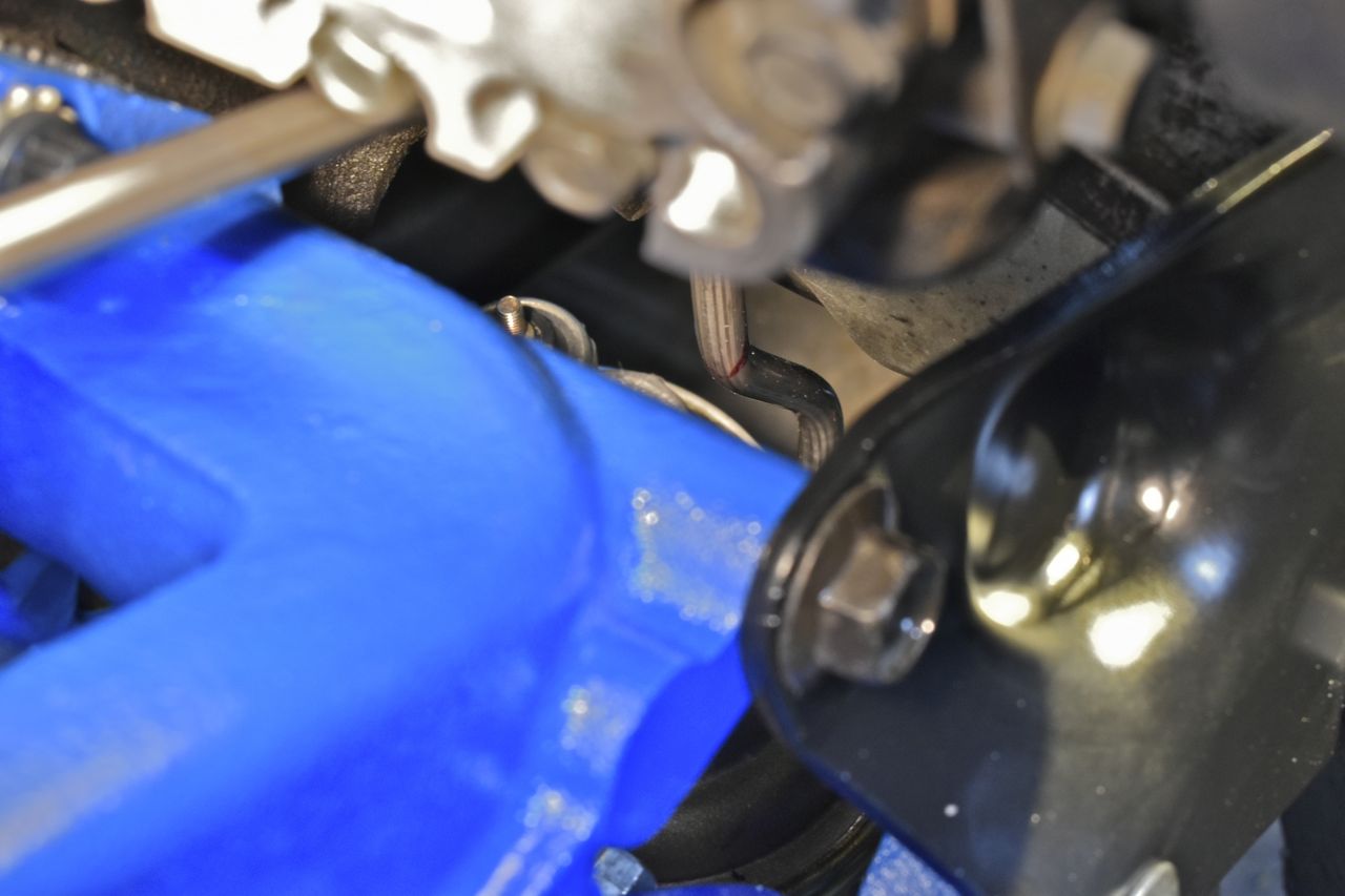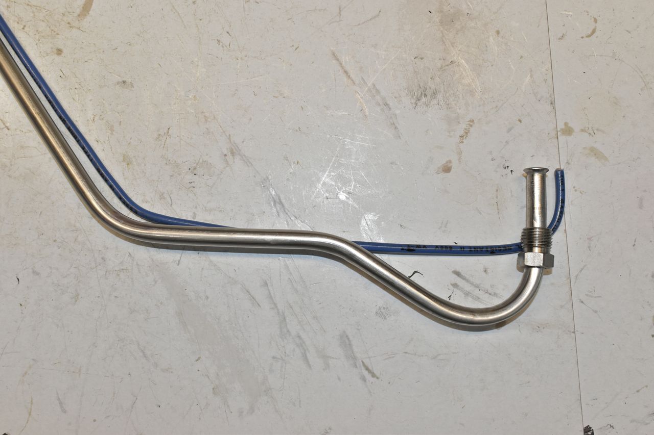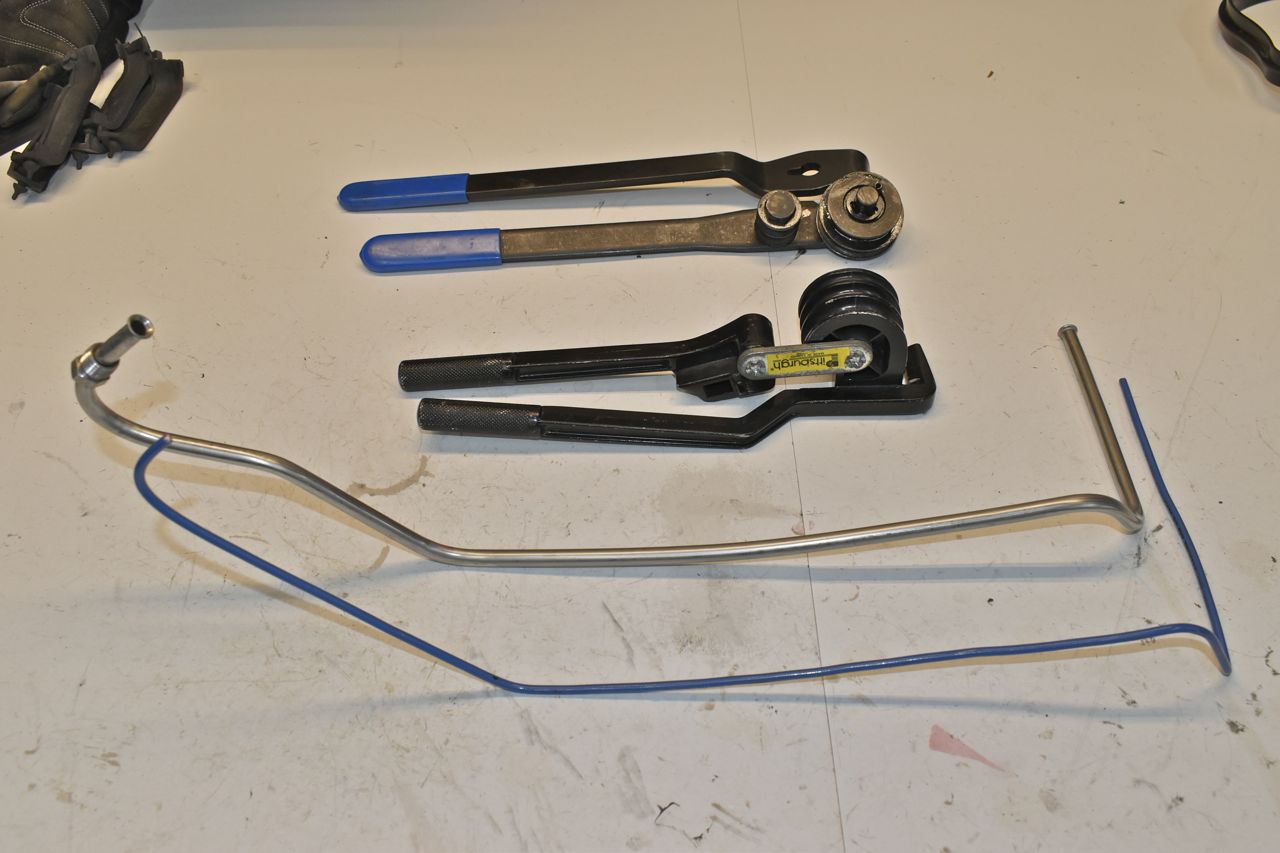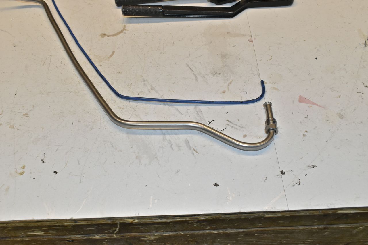 I installed the bracket and set the power steering pump to it's minimum belt setting. I needed to do this to determine where the fuel line would route as not to hit anything. Making this fuel line was a bear but it turned out decent.