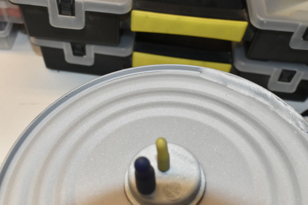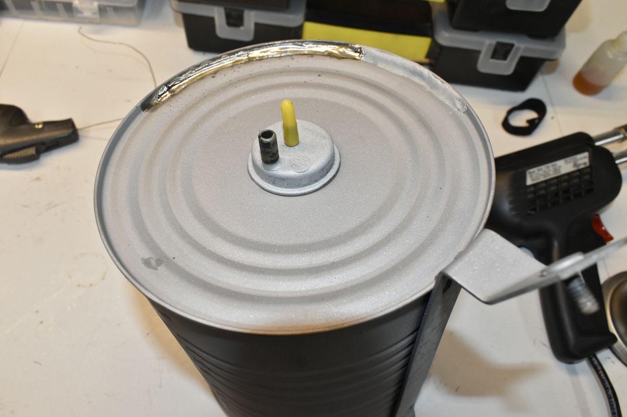Usually this leaks around the centre nipple cap. But this can was blowing bubbles around the top and bottom with a few PSI of air injected into it and sprayed with Windex. Here's the crack on the top side and it looks like someone already soldered another crack sometime in the past.