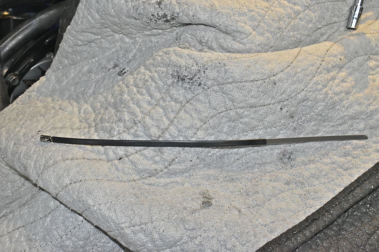 Now for the heater hoses I needed something to keep them together and suspended for a bit. I hate plastic zip ties, but until I change the heater core and remaining two hoses of which I'll use Adel clamps to support them I decided on a stainless zip tie. But to keep the sharp edge of the stainless from cutting into the hoses over time I used industrial grade PVC heat shrink. That stuff is really tough.