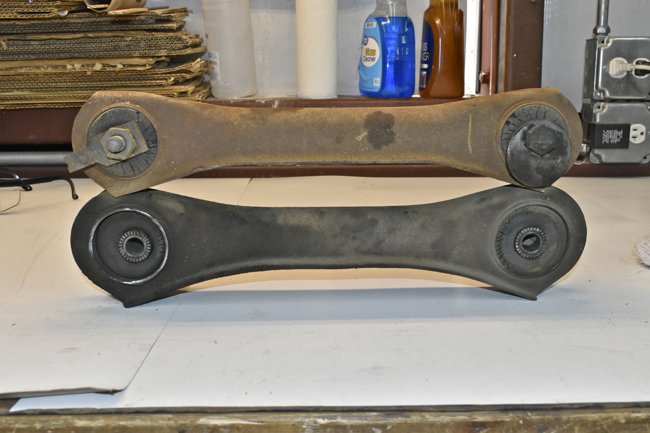 I didn't have a spare rear upper for the '68. So this is the upper out of the '68 XL on the bottom. The top one is the '65/'66 one. Ford changed it in '67 for bigger bushings for more load handling. You can use a '65/'66 in a '67/'68 but not the reverse because the frame pocket in the '65/'66 will not accept the '67/'68 for its full range of travel.