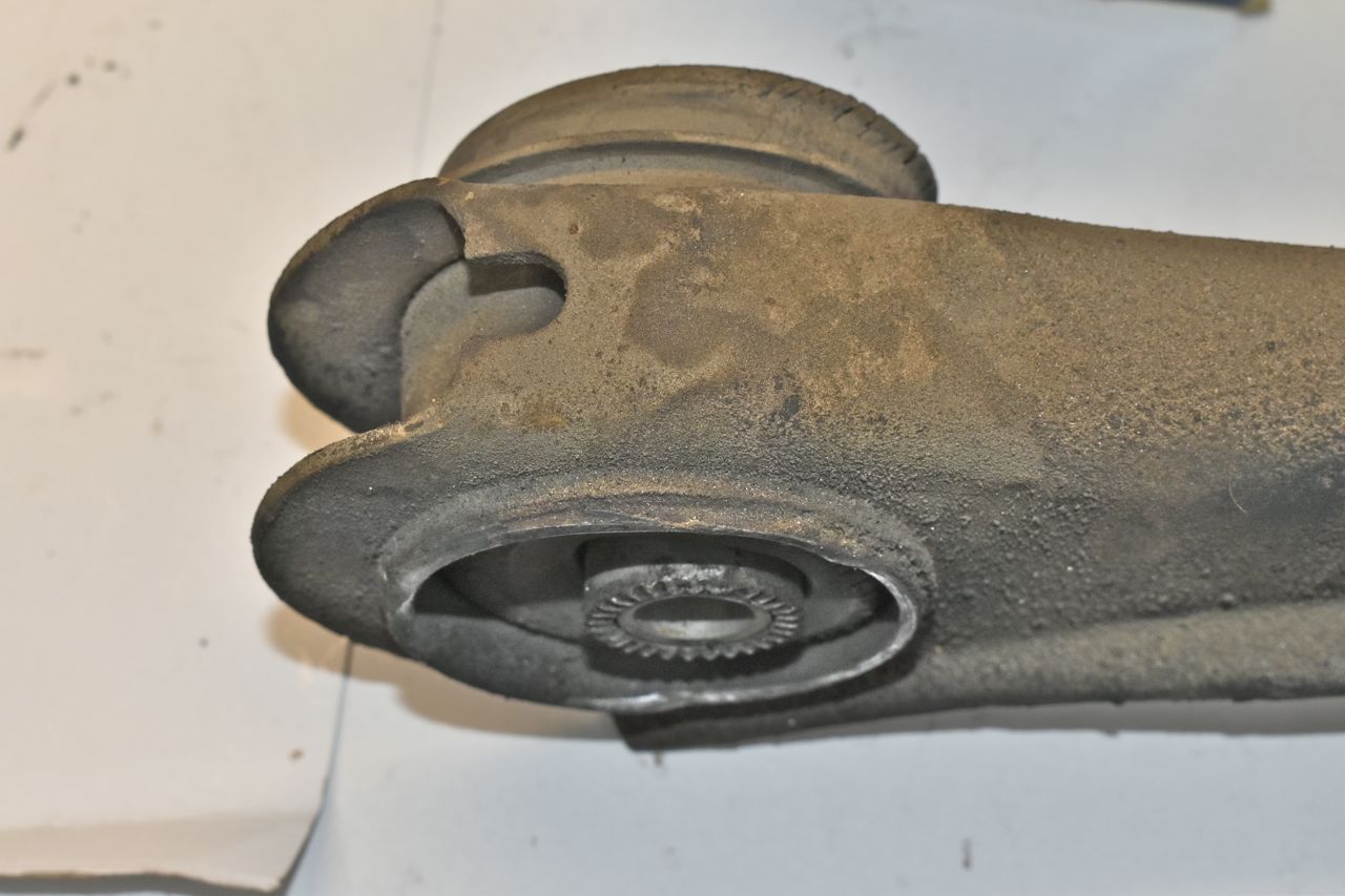 Here's the lower control arms off the '68. They are a little different and they do have holes drilled for a cable clamp. So they are technically interchangeable but you need to drill a hole and they look a little different. The odd thing with the control arms off the '68 XL is one has noticeably different bushings and yellow paint on it. The yellow painted arm has FoMoCo bushings but they are still in good shape. However the other arm has bushings that are completely hard and compressed. You can slide out the inner sleeve with your finger on both of those bushings. This was one reason the car would yaw very noticeably when throttle was applied.