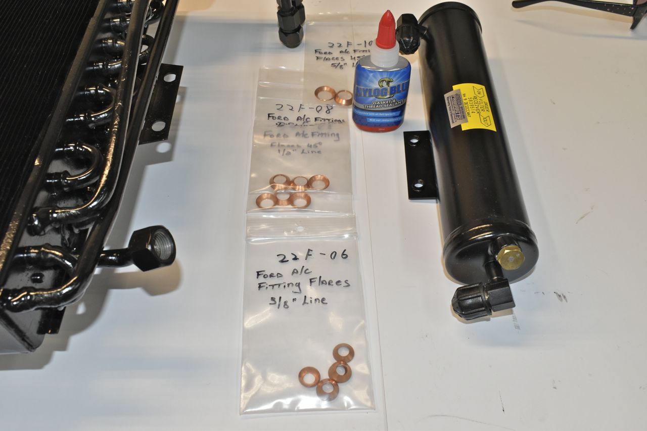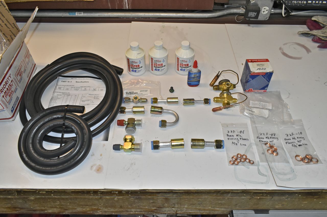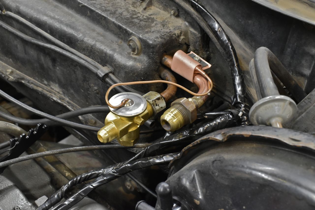 Back to air con hoses and things. Since the 3rd gen full size use an expansion valve that has the 'X' fitting for the liquid line check valve, there's no replacement fittings for these and thus no way to replace that hose. So the work around is use the '67-'68 Mustang expansion valve that has flare fittings on both sides of the valve.