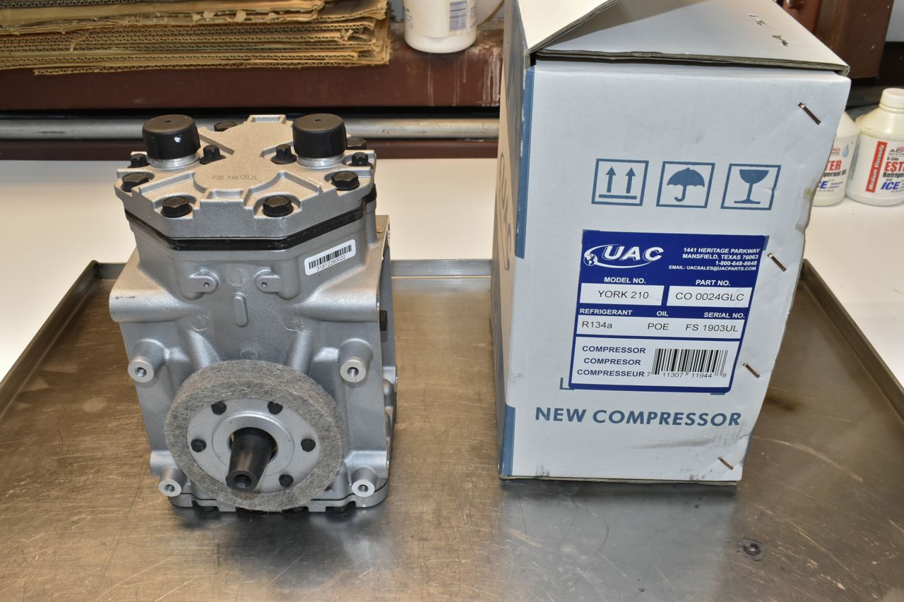 Brand new York 210 compressor. This one is for a Freightliner truck. (class 8, semi). These come with POE oil which is compatible with mineral oil should there be any left in the system.