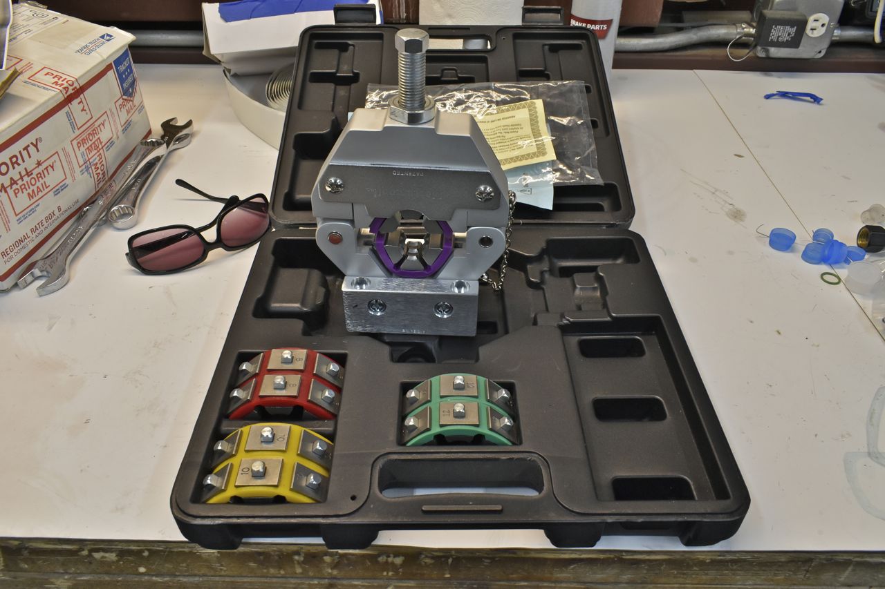 Here I have all the key fixtures and fittings on and getting ready to cut the hose to fit. You can see the sight glass I added at the condenser. If anything it's really easy to see in position.