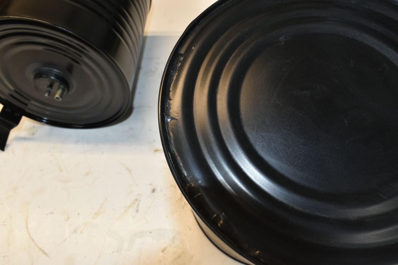 The only way to really fix this would be to strip the paint and lead solder from the can, then effectively anneal the can, but the vacuum port on the end is made from pot metal which would probably melt. So really the best you could do would be strip the can and TIG the edges completely and letting it slowly cool in small welding steps around. It would be tedious.