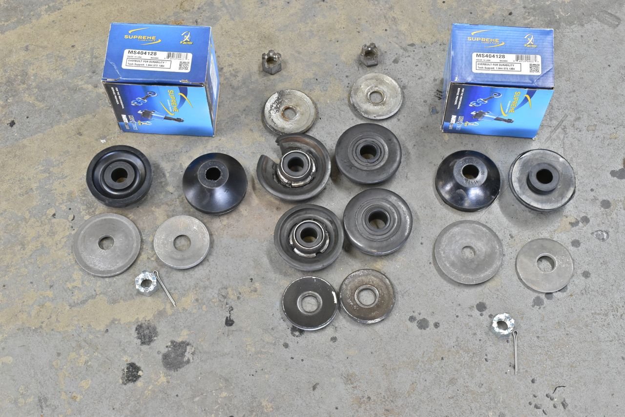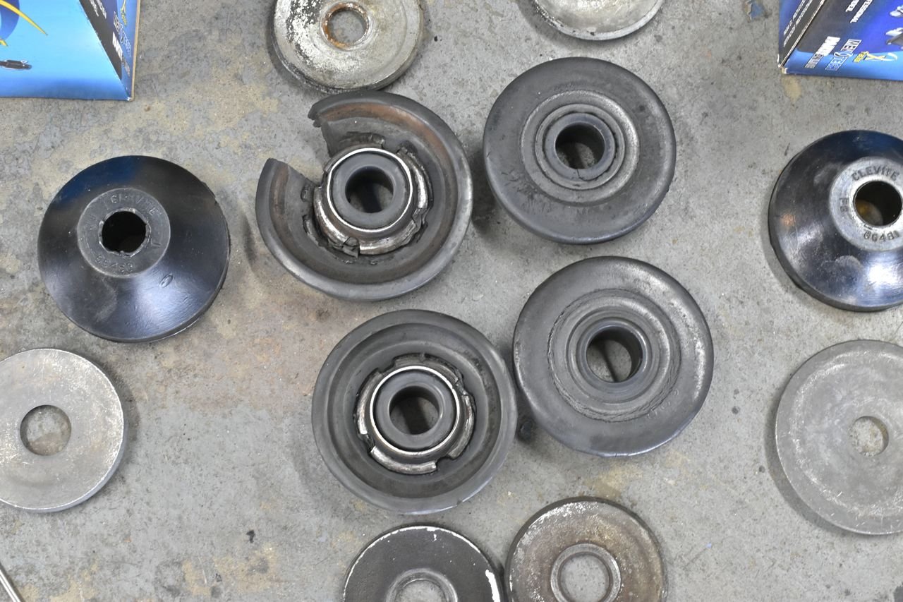 The old strut rods just came right out once the nuts were off. The new bushings required pulling back the lower control arms a bit to get the holes to line up. If the alignment was off before, it's really off now.
