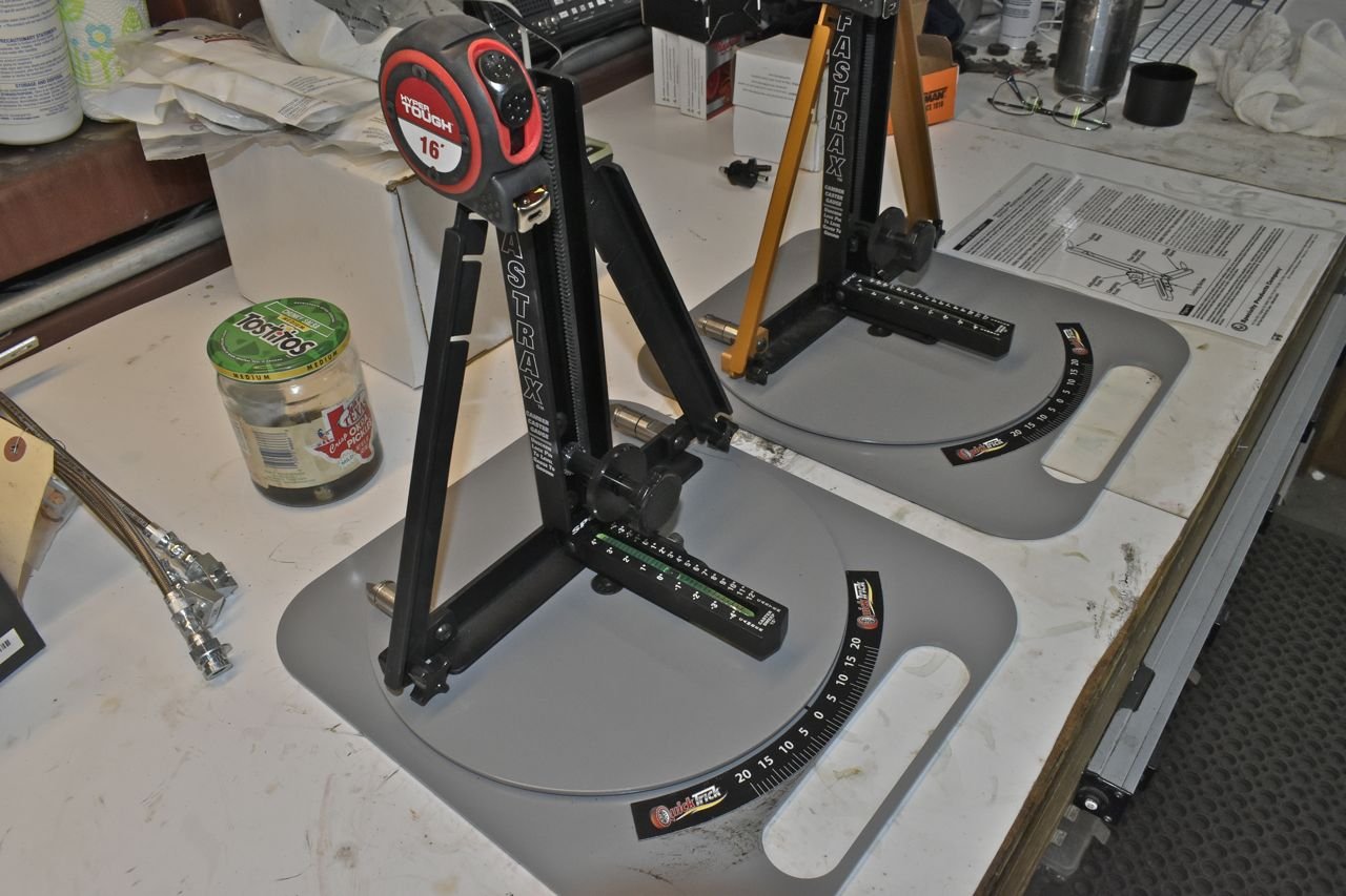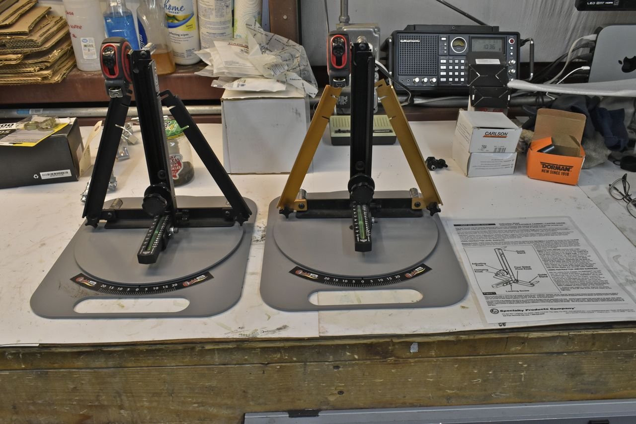 To do the alignment, this is what I use on all our cars. Like my primitive dynamic wheel balancer that spins wheels up to 140 MPH on the car and strobes the heavy spots, these also require more work and expertise to use properly, but also yield good results.