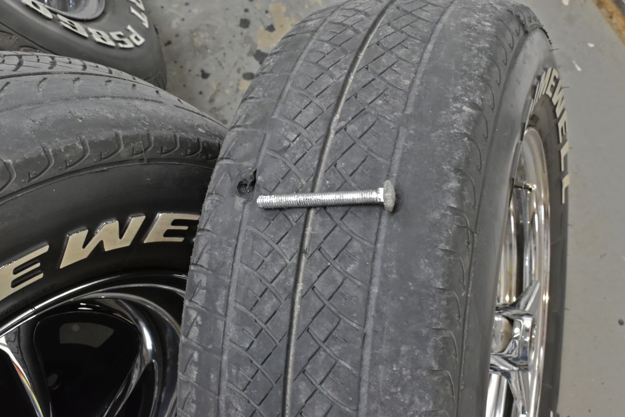 To start off the original tyres on the car granted were in no great shape and several years old, but I ended up with a flat trying to drive into town. Being New Mexico, where the proudest things about this state are broken windscreens and flat tyres in abundance, I'm used to small nails and screws in tyres. However this takes the cake.