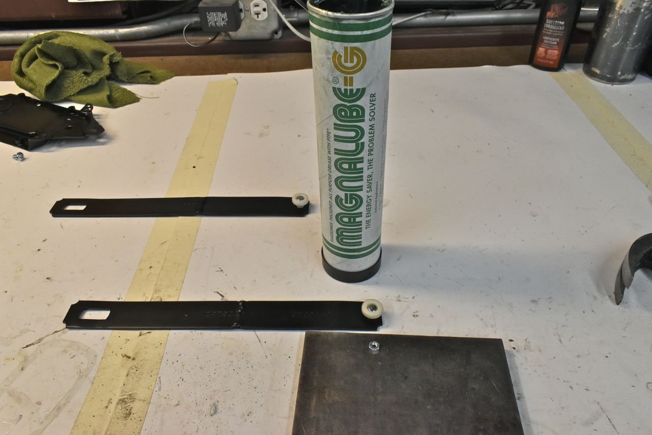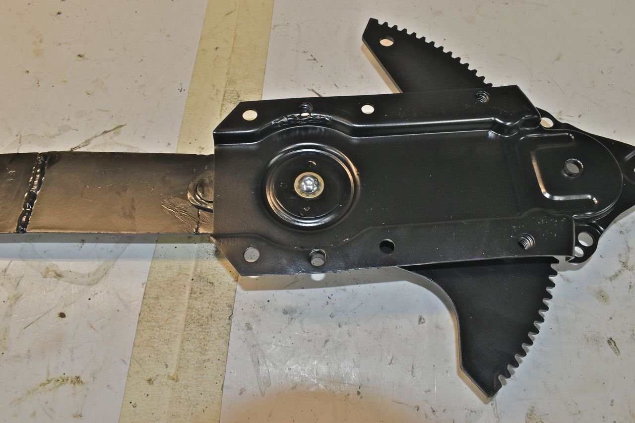OK, on the left is the original 65-68 manual regulator for the 2 door hardtop. Next to it is the new cheap power window regulator for a 80's Ford pickup. Then to right are all the modified parts of both the original and the new pickup regulator ready for assembly. Now you do have to lengthen the arms of the manual regulator. It's quite a bit of cutting and TIG welding.