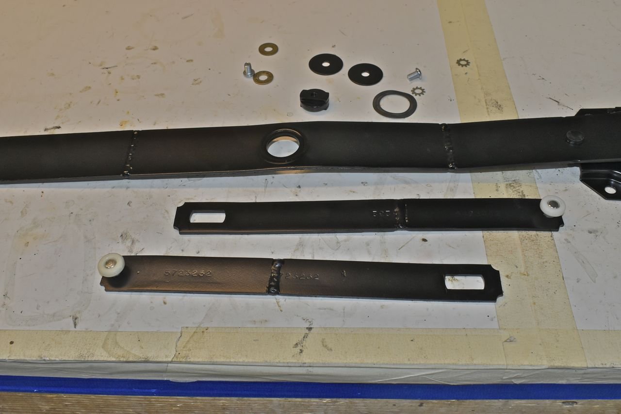 Here's an OEM 65-68 front door power regulator for a 2 door hardtop and the one I cobbled together.